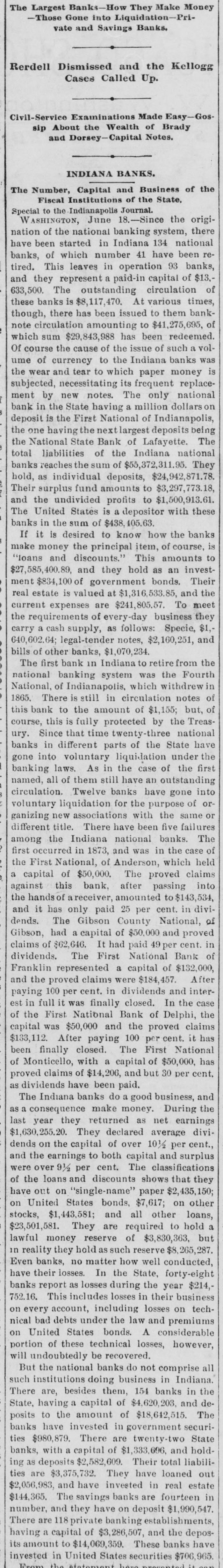 The Largest Banks-How They Make Money -Those Gone into Liquidation-Private and Savings Banks. Rerdell Dismissed and the Kellogg Cases Called Up. Civil-Service Examinations Made Easy-Gos sip About the Wealth of Brady and Dorsey-Capital Notes. INDIANA BANKS. The Number, Capital and Business of the Fiscal Institutions of the State, to the Indianapolis Journal. Special WASHINGTON, June 18.-Since the origination of the national banking system, there have been started in Indiana 134 national banks, of which number 41 have been retired. This leaves in operation 93 banks, and they represent a paid-in capital of $13.- of 633,500. The outstanding circulation these banks is $8,117,470. At various times, though, there has been issued to them bank- of note circulation amounting to $41,275,695, which sum $29,843,988 has been redeemed. Of course the cause of the issue of such a volume of currency to the Indiana banks was the wear and tear to which paper money is subjected, necessitating its frequent replacement by new notes. The only national bank in the State having a million dollars o deposit is the First National of Indianapolis, the one having the next largest deposits being the National State Bank of Lafayette. The total liabilities of the Indiana national banks reaches the sum of $55,372,311.95. They hold, as individual deposits, $24,942,871.78 fund amounts to $3,297,773.18 the undivided profits to and Their surplus $1,500,913.61. with these The United States is a depositor banks in the sum of $438, 405.63. If it is desired to know how the banks make money the principal item, of course, is "loans and discounts." This amounts to $27,585,400.89, and they hold as an investment $834,100 of government bonds. Their real estate is valued at $1,316,533.85, and the current expenses are $241,805.57. To meet the requirements of every-day business they carry a cash supply, as follows: Specie, $1,640,602.64; legal-tender notes, $2,160,251, and bills of other banks, $1,070,234. The first bank in Indiana to retire from the national banking system was the Fourth National, of Indianapolis, which withdrew of 1865. There is still in circulation notes this bank to the amount of $1,155; but, of course, this is fully protected by the Treasury. Since that time twenty-three national banks in different parts of the State have gone into voluntary liquidation under the banking laws. As in the case of the first named, all of them still have an outstanding circulation. Twelve banks have gone into for the purpose of ornew associations with same or ganizing voluntary liquidation the five failures title. There have been the Indiana national in 1873, and was in case of among different first occurred banks. which the held The First National, of Anderson, of $50,000. The a the capital proved claims into against this bank, after passing the hands of a receiver, amounted to $143,534, and it has only paid 25 per cent. in dividends. The Gibson County National, of Gibson, had a capital of $50,000 and proved claims of $62,646. It had paid 49 per cent. in dividends. The First National Bank of a capital Franklin represented $184,457. of $132,000, After and the proved claims were paying 100 per cent. in dividends and interest in full it was finally closed. In the case of the First National Bank of Delphi, the capital was $50,000 and the proved claims $133,112. After paying 100 per cent. it has finally closed. The First National of with a capital of has claims of $14,206, and but 30 per cent. been proved Monticello, $50,000, as dividends have been paid. The Indiana banks do a good business, and make money. During the returned as net They declared average as $1,630,255.20. last a consequence year they earnings dividends on the capital of over 10 1/2 per cent., and the earnings to both capital and surplus were over 9 1/2 per cent. The classifications of the loans and discounts shows that they have out on "single-name" paper $2,435,150; on United States bonds, $7,617; on other stocks, $1,443,581; and all other loans, $23,501,581. They are required to hold a lawful reserve of $3,830,363, but in hold as such reserve no matter how well Even reality banks, money they conducted, $8,265,287. have their losses. In the State, forty-eight banks report as losses during the year $214, 752.16. This includes losses in their business on every account, including losses on technical bad debts under the law and premiums on United States bonds. A considerable portion of these technical losses, however, will undoubtedly be recovered. But the national banks do not comprise all such institutions doing business in Indiana. There are, besides them, 154 banks in the State, having a capital of $4,620,203, and deposits to the amount of $18,642,515. The banks have invested in government securities $980,879. There are twenty-two State banks, with a capital of $1,333,696, and holddeposits $2,582,609. Their total liabiliThey ing ties as are $3,375,732. have in loaned real estate out $2,056,983, and have invested $144,365. The savings banks are fourteen in number, and they have on deposit $1,990,547. There are 118 private banking establishments, a capital of $3,286,507, and the deposto These having its amount $14,069,359. banks $706,965. have invested in United States securities From the statement