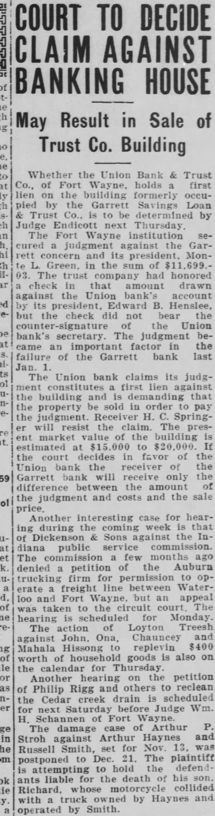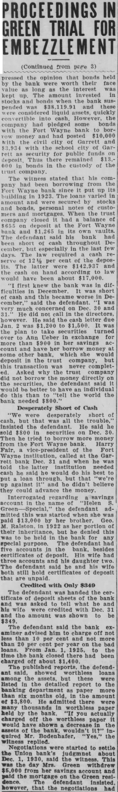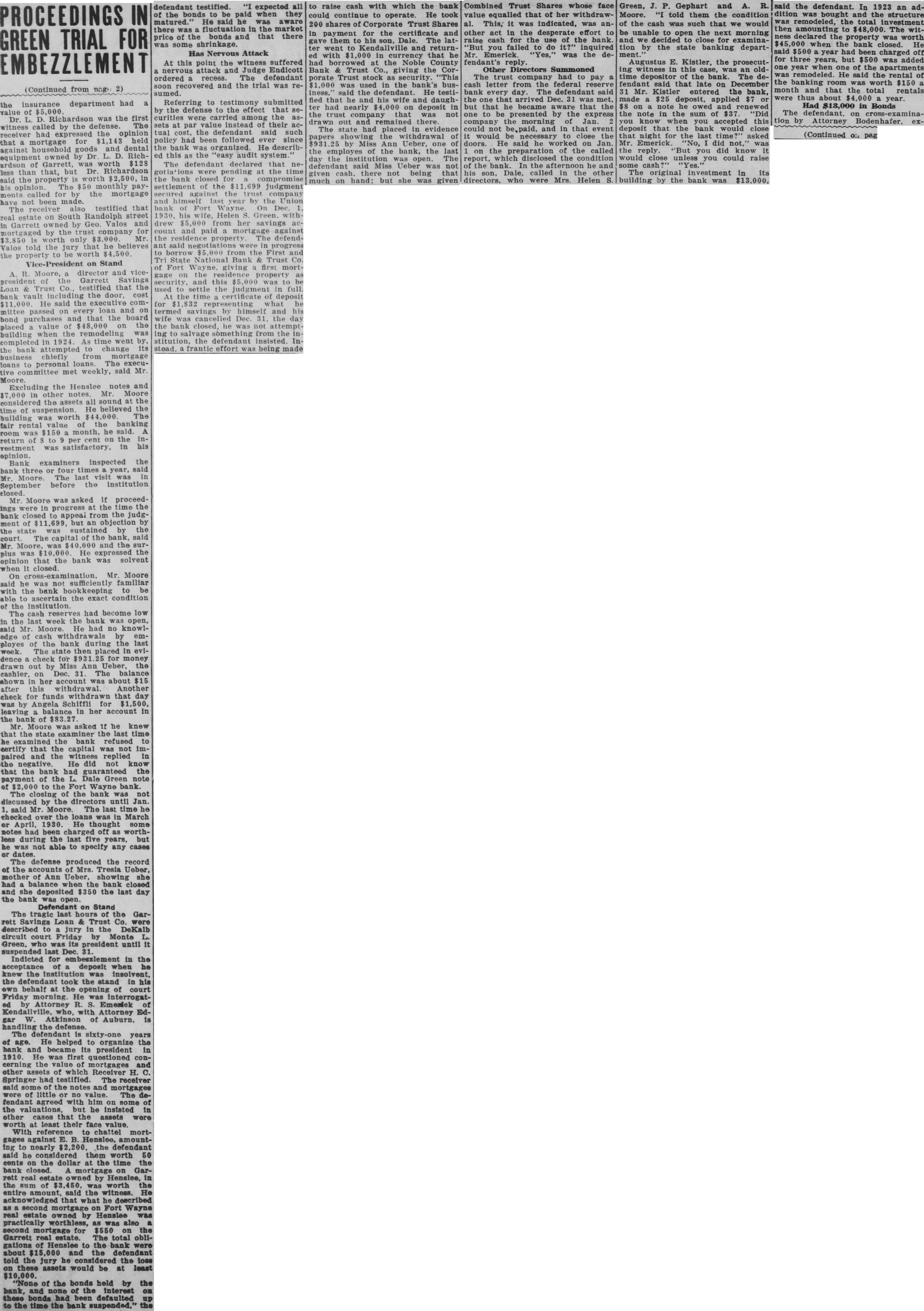 A. R. Moore, a director and vicepresident of the Garrett Savings Loan & Trust Co., testified that the bank vault including the door, cost $11,000. He said the executive committee passed on every loan and on bond purchases and that the board placed a value of $48,000 on the building when the remodeling was completed in 1924. As time went by, the bank attempted to change its business chiefly from mortgage loans to personal loans. The executive committee met weekly, said Mr. Moore. Excluding the Henslee notes and $7,000 in other notes, Mr. Moore considered the assets all sound at the time of suspension. He believed the building was worth $44,000. The fair rental value of the banking room was $150 a month, he said. A return of 8 to 9 per cent on the investment was satisfactory, in his opinion. Bank examiners inspected the bank three or four times year, said Mr. Moore. The last visit was in September before the institution closed. Mr. Moore was asked if proceedings were in progress at the time the bank closed to appeal from the judgment of $11,699, but an objection by the state was sustained by the eourt. The capital of the bank, said Mr. Moore, was and the surplus was $10,000. He expressed the opinion that the bank was solvent when it closed. On cross-examination, Mr. Moore said he was not sufficiently familiar with the bank bookkeeping to be able to ascertain the exact condition of the institution. The cash reserves had become low in the last week the bank was open, said Mr. Moore. He had no knowledge of cash withdrawals by employes of the bank during the last week. The state then placed in evidence check for $931. 25 for money drawn out by Miss Ann Ueber, the cashier, on Dec. 31. The balance shown in her account was about $15 after this withdrawal. Another check for funds withdrawn that day was by Angela Schiffli for $1,500, leaving a balance in her account in the bank of $83.27. Mr. Moore was asked If he knew that the state examiner the last time he examined the bank refused to certify that the capital was not impaired and the witness replied in the negative. He did not know that the bank had guaranteed the payment of the L. Dale Green note of $2,000 to the Fort Wayne bank. The closing of the bank was not discussed by the directors until Jan. 1, said Mr. Moore. The last time he checked over the loans was in March or April, 1930. He thought some notes had been charged off as worthless during the last five years, but he was not able to specify any cases or dates. The defense produced the record of the accounts of Mrs. Tresia Ueber, mother of Ann Ueber, showing she had a balance when the bank closed and she deposited $350 the last day the bank was open. Defendant on Stand The tragic last hours of the Garrett Savings Loan & Trust Co. were described to a jury in the DeKalb circuit court Friday by Monte L. Green, who was its president until it suspended last Dec. 31. Indicted for embezzlement in the acceptance of a deposit when he knew the institution was insolvent, the defendant took the stand in his own behalf at the opening of court Friday morning. He was interrogated by Attorney R. S. Emerick of Kendallville, who, with Attorney Edgar W. Atkinson of Auburn, is handling the defense. The defendant is sixty-one years of age. He helped to organize the bank and became its president in 1910. He was first questioned coneerning the value of mortgages and other assets of which Receiver H. C. Springer had testified. The receiver said some of the notes and mortgages were of little or no value. The defendant agreed with him on some of the valuations, but he insisted in other cases that the assets were worth at least their face value. With reference to chattel mortgages against E. B. Henslee, amounting to nearly $2,200, the defendant said he considered them worth 50 cents on the dollar at the time the bank closed. A mortgage on Garrett real estate owned by Henslee, in the sum of $3,450, was worth the entire amount, said the witness. He acknowledged that what he described as second mortgage on Fort Wayne real estate owned by Henslee was practically worthless, as was also a second mortgage for $550 on the Garrett real estate. The total obligations of Henslee to the bank were about $15,000 and the defendant told the jury he considered the loss on these assets would be at least $10,000. "None of the bonds held by the bank, and none of the interest on these bonds had been defaulted up to the time the bank suspended," the defendant testified. "I expected all of the bonds to be paid when they matured. He said he was aware there was a fluctuation in the market price of the bonds and that there was some shrinkage. Has Nervous Attack At this point the witness suffered a nervous attack and Judge Endicott ordered a recess. The defendant soon recovered and the trial was resumed. Referring to testimony submitted by the defense to the effect that securities were carried among the assets at par value instead of their actual cost, the defendant said such policy had been followed ever since the bank was organized. He described this as the "easy audit system. The defendant declared that negotia ions were pending at the time the bank closed for compromise settlement of the $11.699 judgment secured the trust company and last year by the Union bank of Fort Wayne. On Dec. 1930, his wife, Helen S. Green. with drew 5,000 from her savings account and paid a mortgage against the residence property The defendant said negotiations were in progress to borrow $5,000 from the First and Tri State National Bank & Trust Co. of Fort Wayne, giving a first mortgage on the residence property as security, and this $5 was to be used to settle the judgment in full At the time a certificate of deposit for $1,832 representing what he termed savings by himself and his wife was cancelled Dec 31. the day the bank closed, he was not attempting to salvage something from the institution, the defendant insisted. Instead. a frantic effort was being made t