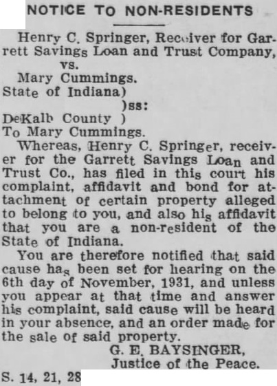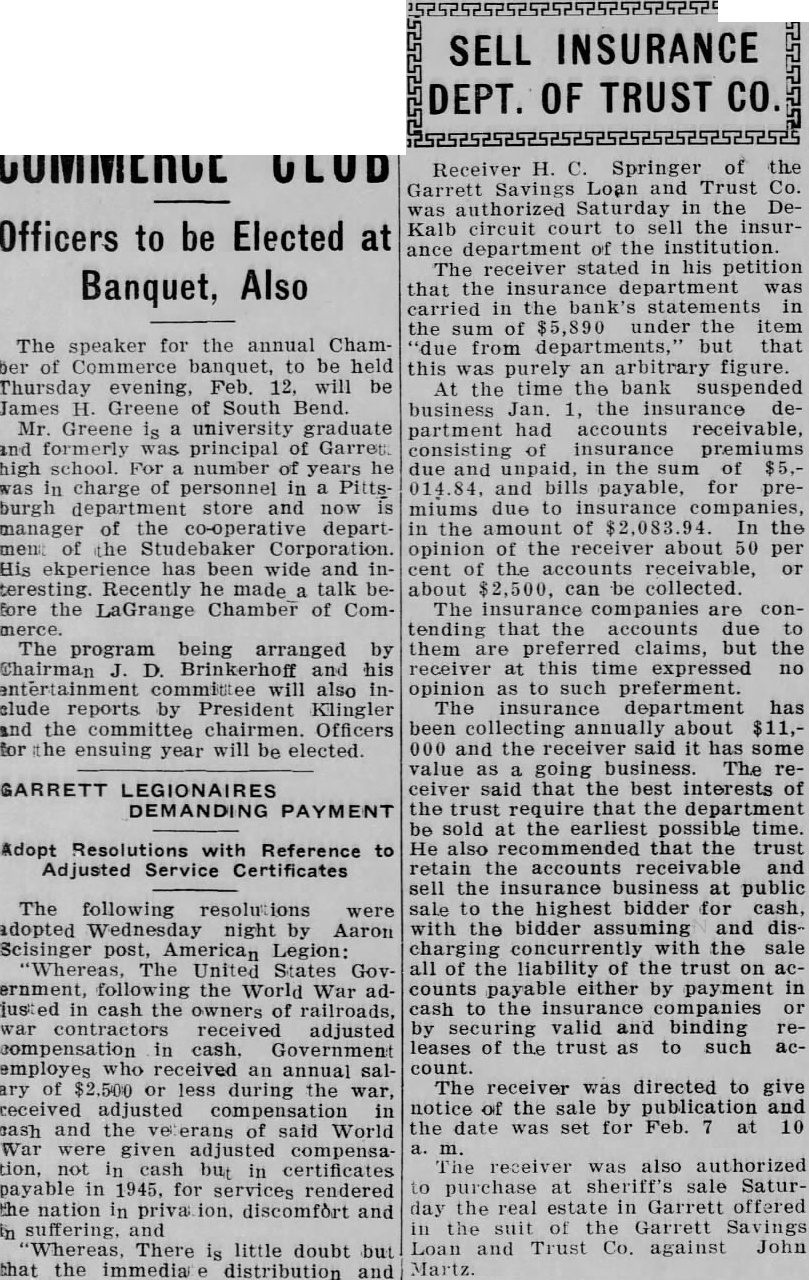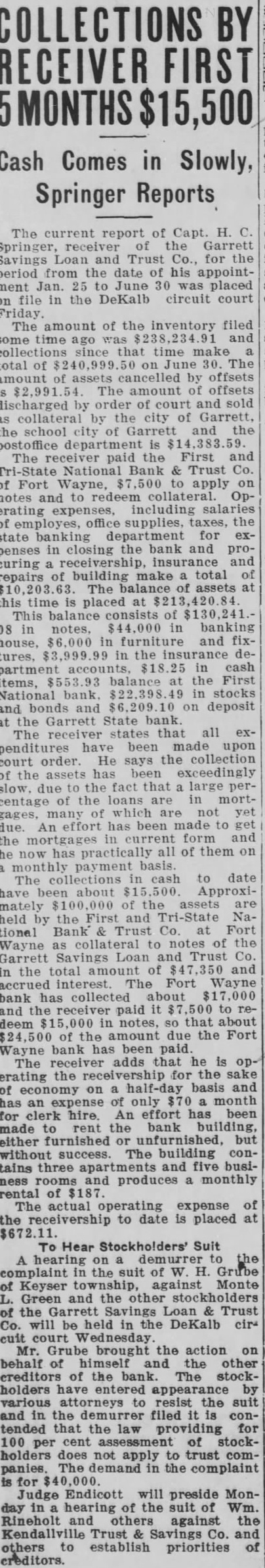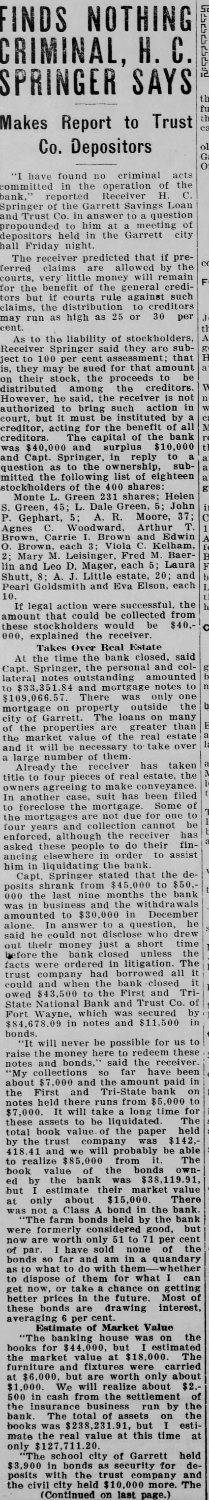 A. R. Moore, a director and vicepresident of the Garrett Savings Loan & Trust Co., testified that the bank vault including the door, cost $11,000. He said the executive committee passed on every loan and on bond purchases and that the board placed a value of $48,000 on the building when the remodeling was completed in 1924. As time went by, the bank attempted to change its business chiefly from mortgage loans to personal loans. The executive committee met weekly, said Mr. Moore. Excluding the Henslee notes and $7,000 in other notes, Mr. Moore considered the assets all sound at the time of suspension. He believed the building was worth $44,000. The fair rental value of the banking room was $150 a month, he said. A return of 8 to 9 per cent on the investment was satisfactory, in his opinion. Bank examiners inspected the bank three or four times year, said Mr. Moore. The last visit was in September before the institution closed. Mr. Moore was asked if proceedings were in progress at the time the bank closed to appeal from the judgment of $11,699, but an objection by the state was sustained by the eourt. The capital of the bank, said Mr. Moore, was and the surplus was $10,000. He expressed the opinion that the bank was solvent when it closed. On cross-examination, Mr. Moore said he was not sufficiently familiar with the bank bookkeeping to be able to ascertain the exact condition of the institution. The cash reserves had become low in the last week the bank was open, said Mr. Moore. He had no knowledge of cash withdrawals by employes of the bank during the last week. The state then placed in evidence check for $931. 25 for money drawn out by Miss Ann Ueber, the cashier, on Dec. 31. The balance shown in her account was about $15 after this withdrawal. Another check for funds withdrawn that day was by Angela Schiffli for $1,500, leaving a balance in her account in the bank of $83.27. Mr. Moore was asked If he knew that the state examiner the last time he examined the bank refused to certify that the capital was not impaired and the witness replied in the negative. He did not know that the bank had guaranteed the payment of the L. Dale Green note of $2,000 to the Fort Wayne bank. The closing of the bank was not discussed by the directors until Jan. 1, said Mr. Moore. The last time he checked over the loans was in March or April, 1930. He thought some notes had been charged off as worthless during the last five years, but he was not able to specify any cases or dates. The defense produced the record of the accounts of Mrs. Tresia Ueber, mother of Ann Ueber, showing she had a balance when the bank closed and she deposited $350 the last day the bank was open. Defendant on Stand The tragic last hours of the Garrett Savings Loan & Trust Co. were described to a jury in the DeKalb circuit court Friday by Monte L. Green, who was its president until it suspended last Dec. 31. Indicted for embezzlement in the acceptance of a deposit when he knew the institution was insolvent, the defendant took the stand in his own behalf at the opening of court Friday morning. He was interrogated by Attorney R. S. Emerick of Kendallville, who, with Attorney Edgar W. Atkinson of Auburn, is handling the defense. The defendant is sixty-one years of age. He helped to organize the bank and became its president in 1910. He was first questioned coneerning the value of mortgages and other assets of which Receiver H. C. Springer had testified. The receiver said some of the notes and mortgages were of little or no value. The defendant agreed with him on some of the valuations, but he insisted in other cases that the assets were worth at least their face value. With reference to chattel mortgages against E. B. Henslee, amounting to nearly $2,200, the defendant said he considered them worth 50 cents on the dollar at the time the bank closed. A mortgage on Garrett real estate owned by Henslee, in the sum of $3,450, was worth the entire amount, said the witness. He acknowledged that what he described as second mortgage on Fort Wayne real estate owned by Henslee was practically worthless, as was also a second mortgage for $550 on the Garrett real estate. The total obligations of Henslee to the bank were about $15,000 and the defendant told the jury he considered the loss on these assets would be at least $10,000. "None of the bonds held by the bank, and none of the interest on these bonds had been defaulted up to the time the bank suspended," the defendant testified. "I expected all of the bonds to be paid when they matured. He said he was aware there was a fluctuation in the market price of the bonds and that there was some shrinkage. Has Nervous Attack At this point the witness suffered a nervous attack and Judge Endicott ordered a recess. The defendant soon recovered and the trial was resumed. Referring to testimony submitted by the defense to the effect that securities were carried among the assets at par value instead of their actual cost, the defendant said such policy had been followed ever since the bank was organized. He described this as the "easy audit system. The defendant declared that negotia ions were pending at the time the bank closed for compromise settlement of the $11.699 judgment secured the trust company and last year by the Union bank of Fort Wayne. On Dec. 1930, his wife, Helen S. Green. with drew 5,000 from her savings account and paid a mortgage against the residence property The defendant said negotiations were in progress to borrow $5,000 from the First and Tri State National Bank & Trust Co. of Fort Wayne, giving a first mortgage on the residence property as security, and this $5 was to be used to settle the judgment in full At the time a certificate of deposit for $1,832 representing what he termed savings by himself and his wife was cancelled Dec 31. the day the bank closed, he was not attempting to salvage something from the institution, the defendant insisted. Instead. a frantic effort was being made t
