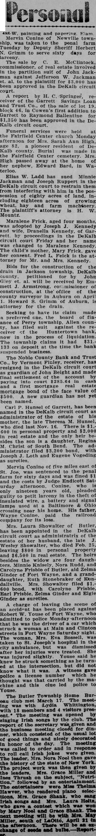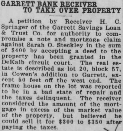 (Continued from DAG 2) the insurance department had a value of Dr. L. D. Richardson was the first witness called by the defense. The receiver had expressed the opinion that a mortgage for $1,143 held against household goods and dental equipment owned by Dr. L. D. Richardson of Garrett, was worth $128 less than that, but Dr. Richardson said the property is worth $2,500, in his opinion. The $50 monthly payments called for by the mortgage have not been made. The receiver also testified that real estate on South Randolph street in Garrett owned by Geo. Valos and mortgaged by the trust company for $3,850 is worth only $3,000. Mr. Valos told the jury that he believes the property to be worth $4,500. Vice-President on Stand