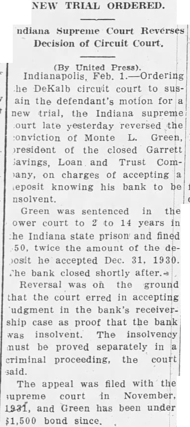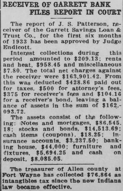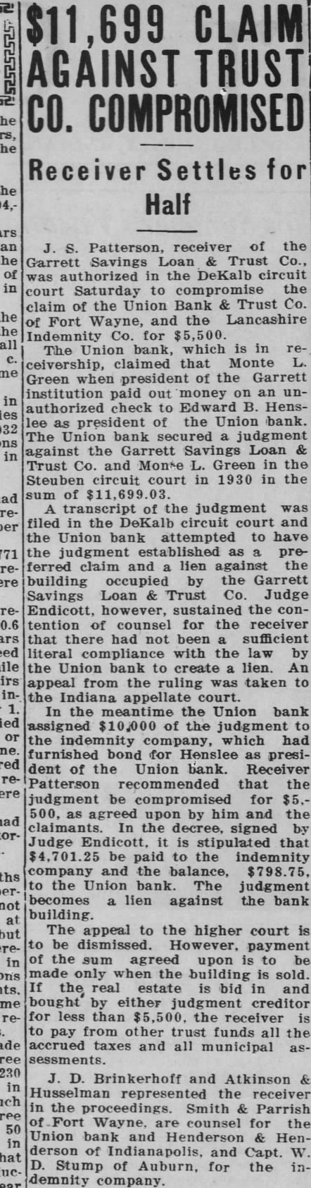 Patterson, receiver of the Garrett Savings Loan Trust Co., authorized in the DeKalb circuit court Saturday to compromise the claim of the Union Bank Trust Co. of Fort Wayne, and the Lancashire Indemnity for $5,500. The Union bank, which is in ceivership, claimed that Monte Green when president of the Garrett institution paid out money on an unauthorized check to Edward B. Henslee as president of the Union bank. The bank secured judgment against the Garrett Savings Loan Trust Co. and Monte Green in the Steuben circuit court in 1930 in the of transcript of the judgment filed in the DeKalb circuit court and the Union bank attempted to have the judgment established as preferred claim and lien against the building occupied by the Garrett Savings Loan & Trust Co. Judge Endicott, however, sustained the contention counsel for the receiver that there had been sufficient literal compliance with the law by the Union bank to create lien. An appeal from the ruling was taken to the appellate court. In the meantime the Union bank of the judgment to the which had furnished bond for Henslee president of the Union bank. Receiver Patterson recommended that the judgment be compromised for 500, as agreed upon by him and the claimants. In the decree, signed by Judge Endicott. is stipulated that be paid to the indemnity company and the balance, the Union The judgment becomes lien against the bank building. The appeal to the higher court to be However, payment of the sum agreed upon to be made only the is sold. the real estate is bid in and bought by either creditor for less than the receiver to pay from other trust funds all the accrued taxes and all municipal assessments.