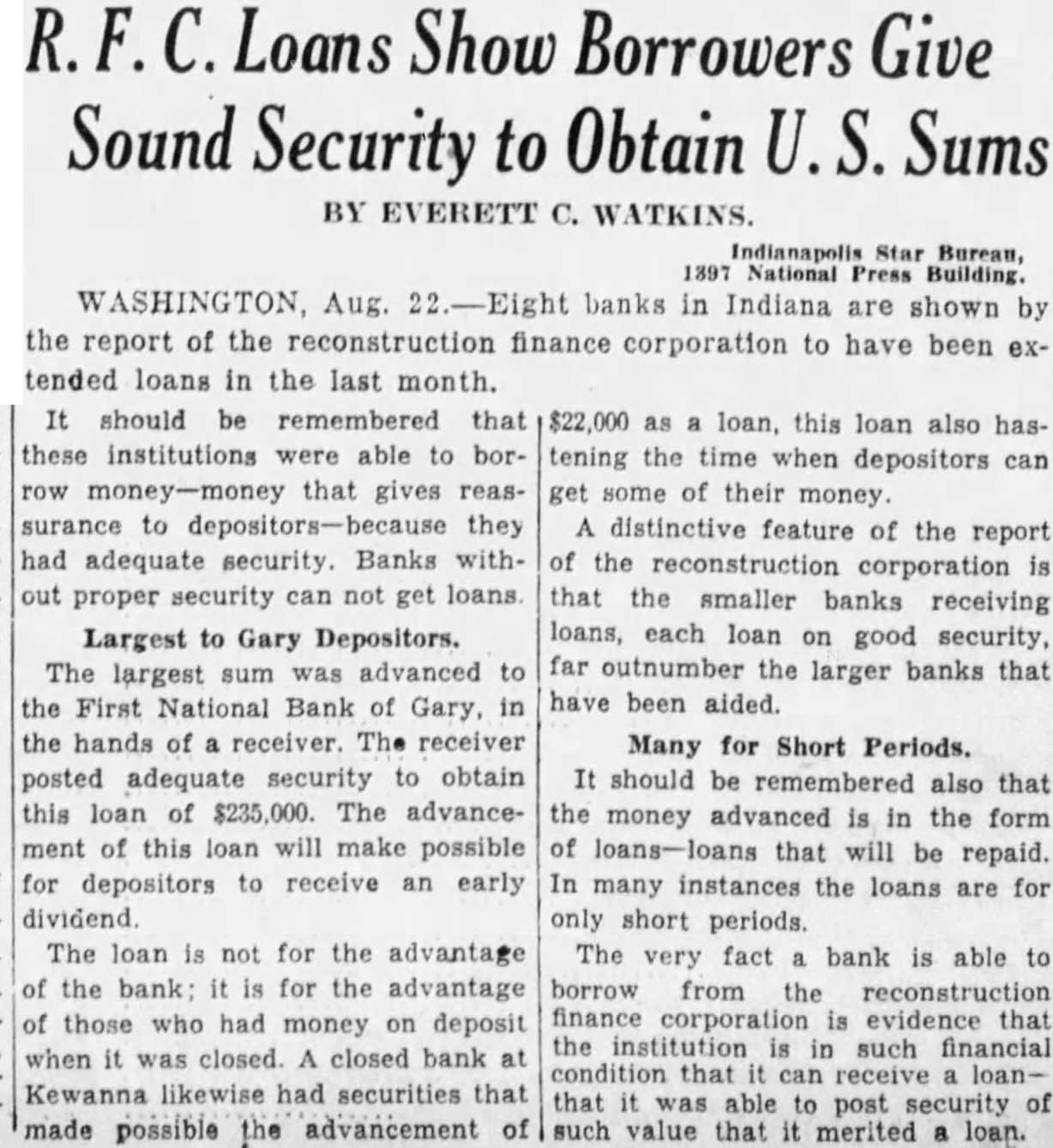 Show Borrowers Give Sound Security to Obtain BY EVERETT Aug. banks in Indiana are shown the report of the reconstruction finance corporation to have been extended loans in the last month. It should remembered institutions were able to row that gives surance to they had adequate security. Banks without proper security can not get Largest to Gary Depositors. The largest sum advanced the First National Bank Gary, the hands of receiver. The receiver posted adequate security obtain this loan $235,000. The advancement of this loan will make possible depositors receive early The loan not for the advantage the for the those who had money deposit closed bank Kewanna likewise had securities that advancement loan, this loan also hastening the time when depositors can get some their money. distinctive feature of the report the reconstruction corporation that the smaller banks receiving each loan good security, far outnumber the larger banks that been aided. Many for Short Periods. It should be remembered that also the money advanced in form that be repaid. In many instances the loans are for short periods. The very fact bank able borrow from that the such post security value merited