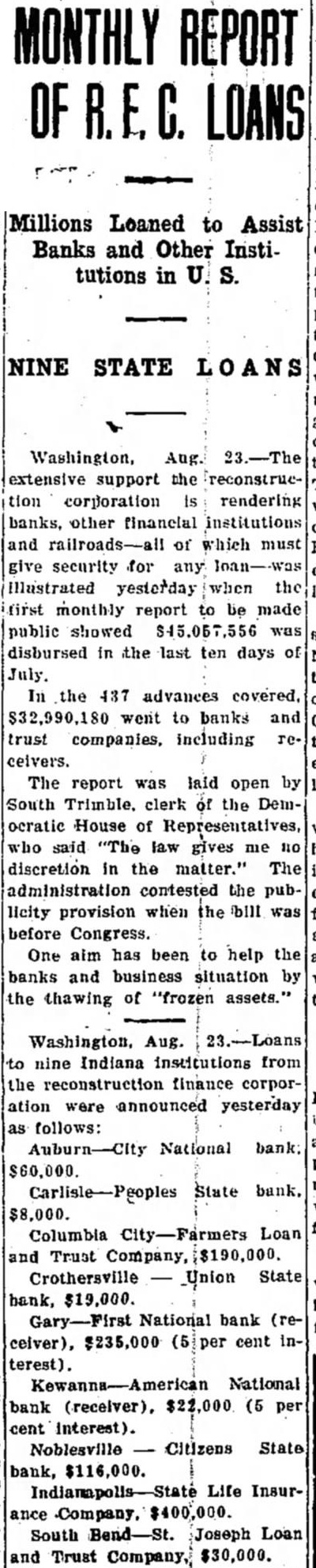 MONTHLY REPORT OF R.E.C. LOANS Millions Loaned to Assist Banks and Other Institutions in U. S. NINE STATE LOANS Washington, Aug. extensive support the reconstruetion corporation is rendering banks, other financial institutions and railroads-all of which must give security for any loan-was Illustrated yesterday when the first monthly report to be made public showed $45,057,556 was disbursed in the last ten days of July. In the 437 advances covered. $32,990,180 went to banks and trust companies, including receivers. The report was laid open by South Trimble. clerk of the Democratic House of Representatives, who said "The law gives me no discretion in the matter." The administration contested the publicity provision when the bill was before Congress. One aim has been to help the banks and business situation by the thawing of "frozen assets." Washington, Aug. 23.-Loans to nine Indiana institutions from the reconstruction finance corporation were announced yesterday as follows: Auburn-City National bank: Carlisle-Peoples State $8,000. Columbia City-Farmers Loan and Trust Company, Crothersville Union State bank, $19,000. Gary-First National bank (receiver), $235,000 (5 per cent interest). Kewanna-American National bank (receiver). $22,000 (5 per cent interest). Noblesville Citizens State bank, $116,000. Indianapolls-State Life Insurance Company, $400,000. South Bend-St. Joseph Loan and Trust Company, $30,000.