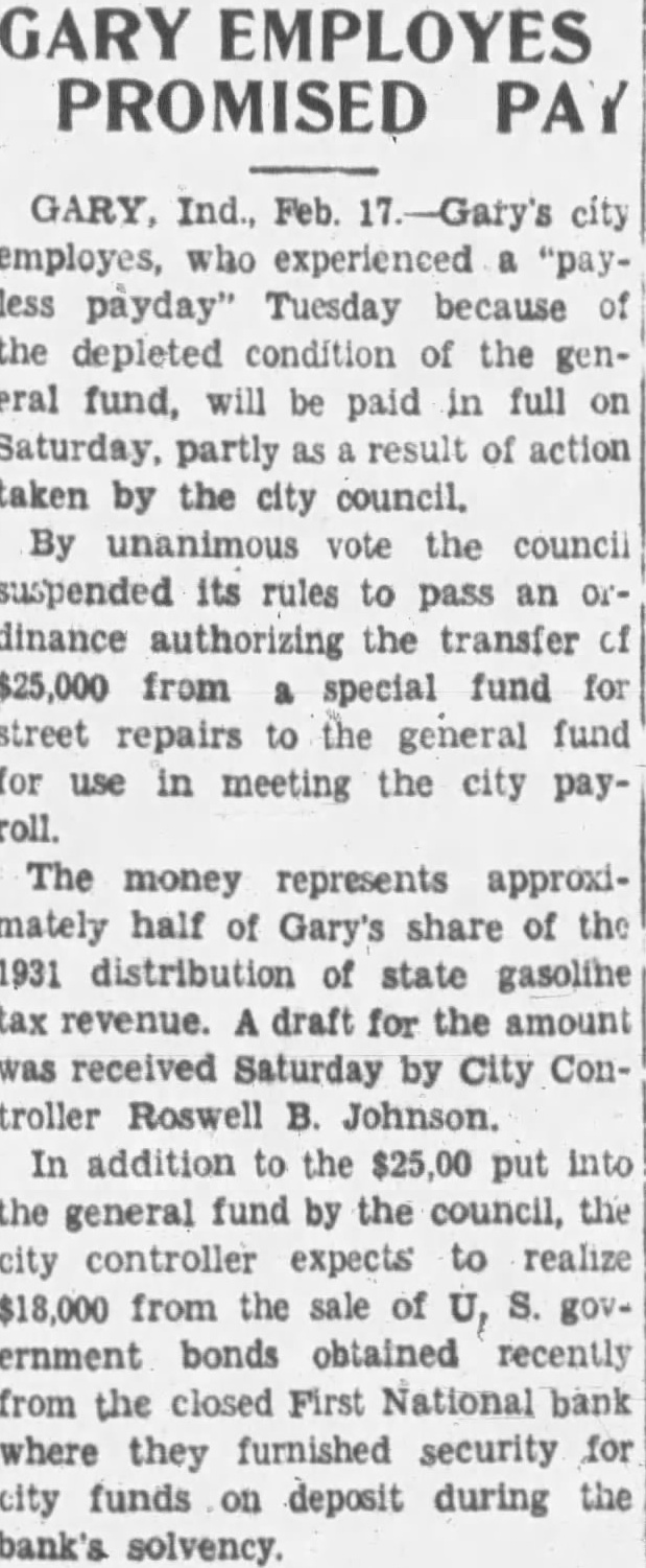 GARY EMPLOYES PROMISED PAY GARY, Ind., Feb. 17.-Gaty's city employes, who experienced "payless payday" Tuesday because the depleted condition of the general fund, will be paid in full on Saturday, partly result of action taken by the city council, By unanimous vote the council suspended its rules to pass an dinance authorizing the transfer $25,000 from special fund for street repairs to the general fund for use in meeting the city payroll. The money represents approximately half of Gary's share of the 1931 distribution of state gasoline tax revenue. A draft for the amount was received Saturday by City Controller Roswell B. Johnson. In addition to the $25,00 put into the general fund by the council, the city controller expects to realize $18,000 from the sale of U, S. government bonds obtained recently from the closed First National bank where they furnished security for city funds on deposit during the bank's solvency.