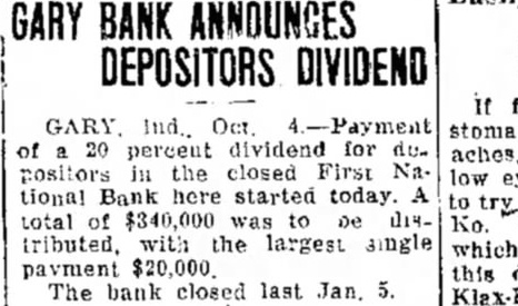 GARY BANK ANNOUNCES DEPOSITORS DIVIDEND Oct. 4.-Payment of 20 percent dividend for du. positors in the closed First Na. tional Bank here started today. A total of $340,000 was to De d14tributed, with the largest single The bank closed last Jan. 5.