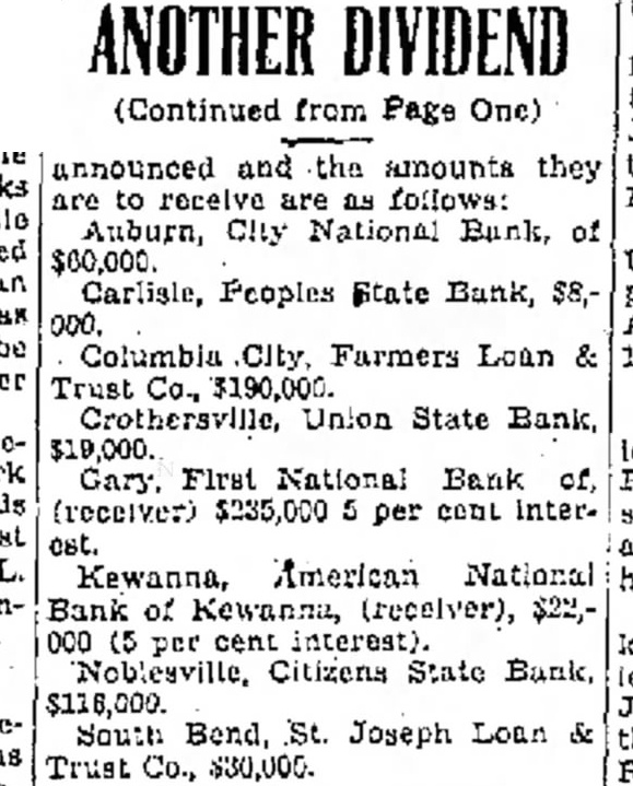 (Continued from One) announced and the amounts they to are follows: Auburn, City National Bank, $60,000 Carlisle, Peoples State Bank, $8,Columbia City, Farmers Loan Co., Union State Bank, Gary. Flrst National Bank of, (receiver) $235,000 per COOL interest. Kewanna, American National Bank of (receiver), $22,Noblesville, Citizens State Bank, South Bend, St. Joseph Loan Trust Co., $30,000.