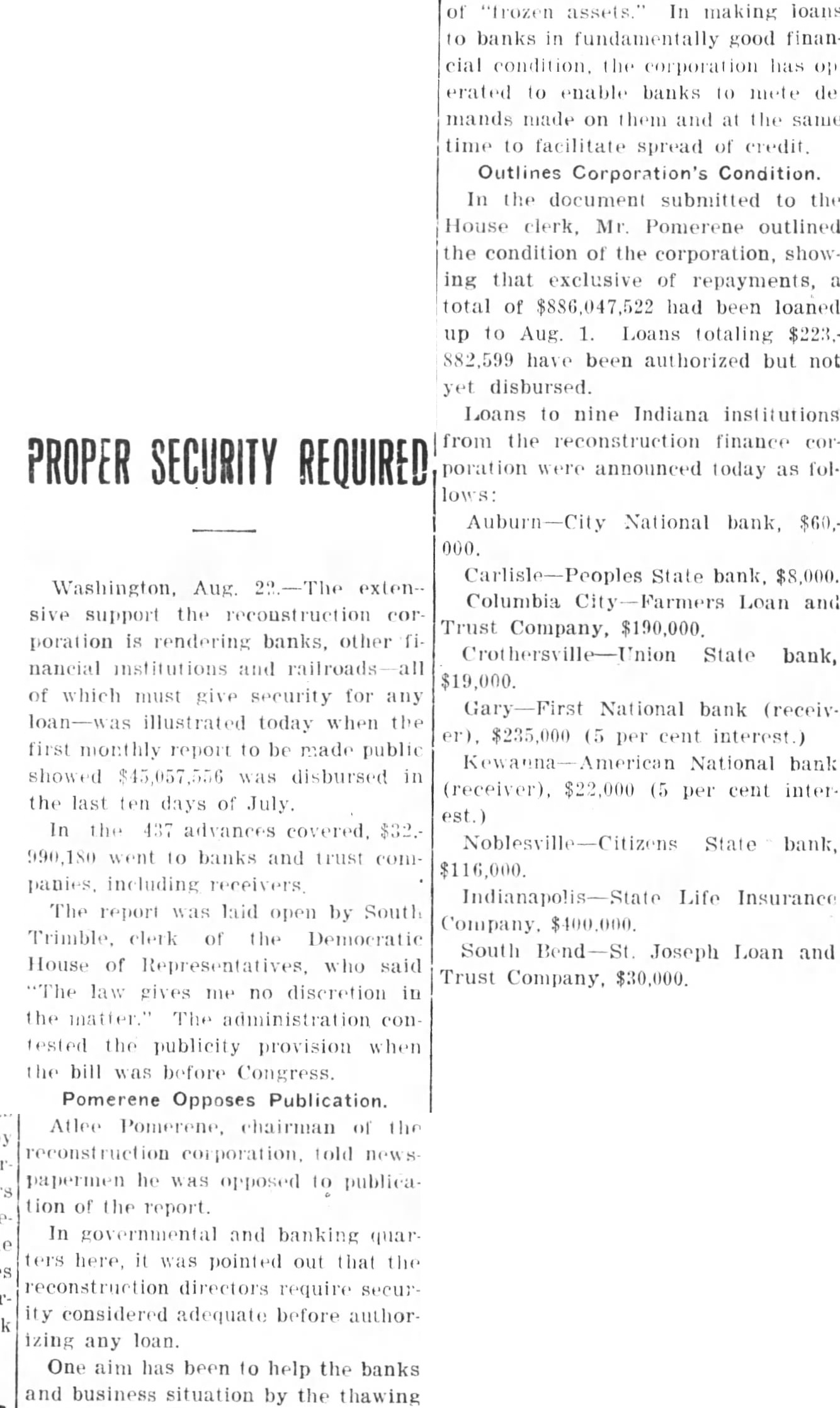 PROPER SECURITY REQUIRED Washington, Aug. 22.-The extensive support the reconstruction cor poration is rendering banks, other financial institutions and railroads all of which must give security for any loan-was illustrated today when the first monthly report to be made public showed $45,057,556 was disbursed in the last ten days of July. In the 437 advances covered, $32. 990,180 went to banks and trust companies, including receivers The report was laid open by South Trimble, clerk of the Democratic House of Representatives, who said "The law gives me no discretion in the matter." The administration contested the publicity provision when the bill was before Congress. Pomerene Opposes Publication. Atlee Pomerene, chairman of the reconstruction corporation, told news papermen he was opposed to publication of the report. In governmental and banking quar ters here, it was pointed out that the reconstruction directors require security considered adequate before authorizing any loan. One aim has been to help the banks and business situation by the thawing of "frozen assets." In making loans to banks in fundamentally good financial condition, the corporation has op erated to enable banks to mete de mands made on them and at the same time to facilitate spread of credit. Outlines Corporation's Condition. In the document submitted to the House clerk, Mr. Pomerene outlined the condition of the corporation, show ing that exclusive of repayments, a total of $886,047,522 had been loaned up to Aug. 1. Loans totaling $223.882,599 have been authorized but not yet disbursed. Loans to nine Indiana institutions from the reconstruction finance cor poration were announced today as follows: Auburn-City National bank, $60,000. Carlisle-Peoples State bank, $8,000. Columbia Farmers Loan and Trust Company, $190,000 Crothersville-Union State bank, $19,000. Gary-First National bank (receiver), $235,000 (5 per cent interest.) Kewanna-American National bank (receiver), $22,000 (5 per cent interest.) Noblesville-Citizens State bank, Indianapolis-State Life Insurance South Bend-St. Joseph Loan and Trust Company, $30,000.