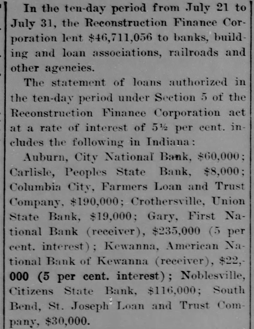 In the period from July July the Reconstruction Finance Corporation lent to banks, build and loan associations, railroads and ing other agencies. The statement of loans authorized the period under Section of the Reconstruction Finance Corporation act rate of interest of per cent. cludes the following in Indiana: Auburn, City National Bank, $60,000; Carlisle, Peoples State Bank, $8,000; Columbia City, Farmers Loan Trust Crothersville, Union Company, State Bank, $19,000; Gary, First tional Bank (receiver), $235,000 cent. Kewanna, American tional Bank of Kewanna (receiver), 000 (5 per cent. Citizens State Bank, $116,000; South Bend, Joseph Loan and Trust $30,000.