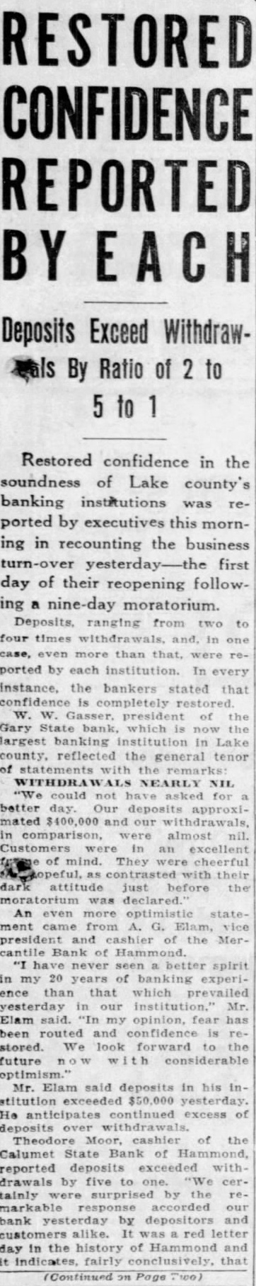 RESTORED CONFIDENCE REPORTED BY Deposits Exceed WithdrawBy Ratio of 2 to 5 to 1 Restored confidence in the soundness of Lake county's banking institutions was reported by executives this morning in recounting the business turn-over yesterday-the first day of their reopening following a nine-day moratorium. Deposits, ranging from four times in more than were reported by each institution. In every Instance, the bankers stated that confidence W. W. president the Gary State bank. which is largest banking institution in Lake county. reflected the general tenor of statements the remarks: NEARLY NIL could not for better day. Our deposits approximated $400,000 and our in almost nil. Customers an excellent of mind. cheerful contrasted their attitude just before the declared. An even more optimistic ment came from G. Elam, president and cashier of the Mercantile Bank of Hammond. seen better spirit in my 20 years of banking experience than that which prevailed yesterday in our Mr. said. "In my opinion, fear has been routed and confidence stored. We look forward to the future optimism." Mr. Elam said deposits in his He excess of Theodore cashier of the Calumet State Bank of reported deposits withdrawals by five tainly surprised by the markable accorded bank by depositors and customers alike. letter day in the history of Hammond and fairly that (Continued on Page