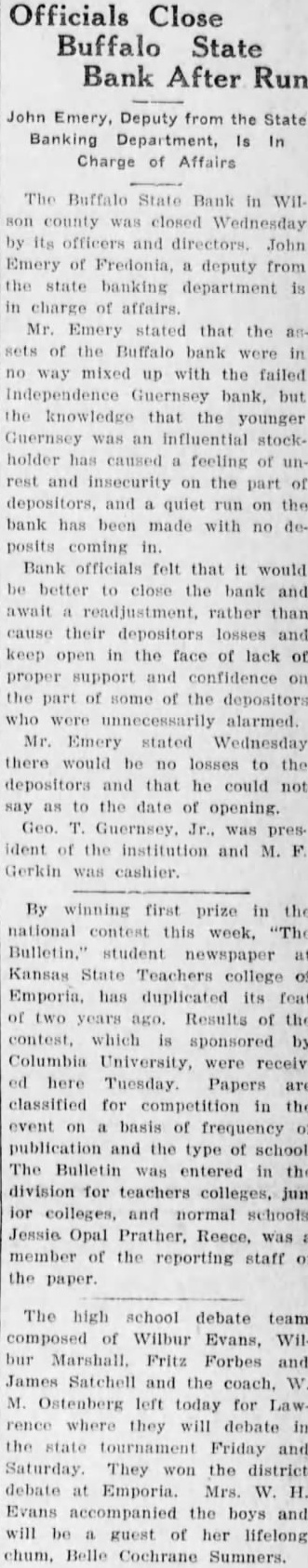 Officials Close Buffalo State Bank After Emery, Deputy from the State Banking Department, Charge Affairs The Buffalo State Bank in county closed Wednesday officers and directors. John Emery Fredonia, deputy from banking department charge of affairs. Mr. Emery stated that the of the Buffalo bank mixed with the failed Independence Guernsey bank. but knowledge that the younger Guernsey an influential holder has caused feeling of rest and insecurity on the depositors, and quiet the bank has been made with no deposits coming Bank officials felt that it would better close the bank and await readjustment, rather than their depositors losses and keep open in the face of lack of proper support and confidence the part some of the depositors unnecessarily alarmed. Mr. Emery stated Wednesday there would be losses the depositors and that he could to the date of opening. Geo. president the institution and Gerkin cashier. By winning first prize the national contest this Bulletin." student newspaper Kansas State Teachers college of Emporia, has duplicated feat two years ago. Results of the contest, which sponsored by Columbia University, receivhere Tuesday. Papers classified for competition in the event basis of frequency publication and the of school. The Bulletin was entered in the division for teachers colleges, colleges, and normal schools Jessie Opal Prather. Reece, member of the reporting staff the paper. The high school debate team composed Wilbur Evans, WilFritz Forbes and James Satchell and the coach, Ostenberg left today for where they will debate the tournament Friday and Saturday. They won the district debate Mrs. Evans accompanied the boys and will guest of her lifelong chum, Belle Cochrane