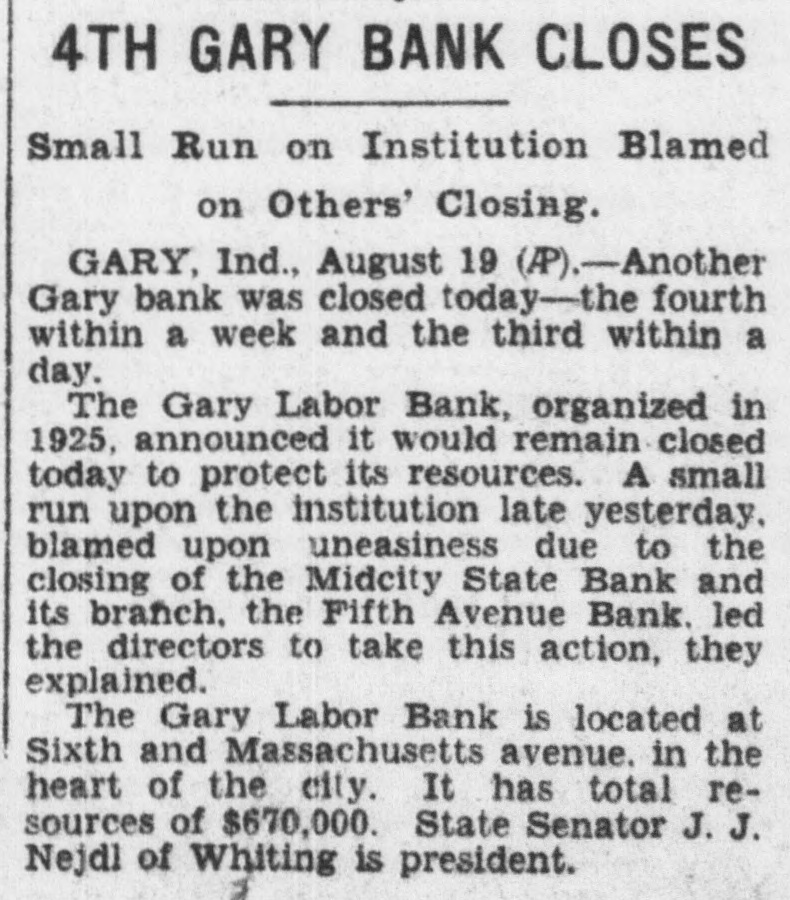 TWO BANKS CLOSED Heavy Withdrawals Blamed for Gary Crashes. By United Press GARY, Ind., Aug. 18.-Two Gary state banks failed to open their doors for business today, bringing the total here to three in eight days. The banks are the Mid-City State bank and the Fifth Avenue Bank of Gary. Both institutions was closely related, in that stockholders and directors of the two practically are the same. Directors ordered the Mid-City bank closed because of weakened financial conditions. It was reported caused by business depression, recent heavy withdrawals and frozen assets. The bank was capitalized at $100,000 and had a surplus of $25,000. Although the condition of the Fifth Avenue bank was said to be good, it was closed because of the relationship with the other. Directops said they feared a run if it be opened after the Mid-City bank was closed. Capitalization was $50,000 and surplus $15,000.