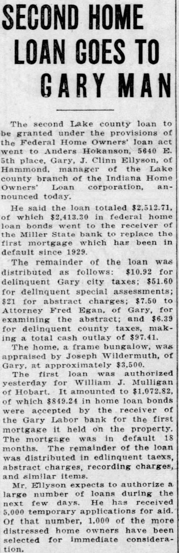 SECOND HOME LOAN GOES TO MAN second Lake county loan to granted under the provisions the Home Owners' Anders E. 5th place, Gary, Clinn Ellyson, of the Lake county of Indiana Home Owners' corporation, nounced today. He the loan totaled home loan the receiver the Miller bank replace the which has been default since 1929 The remainder of the loan was distributed $10.92 for delinquent Gary city for delinquent special $21 for abstract charges; $7.50 Attorney Fred Gary, for examining the abstract; and $6.39 for delinquent county taxes, maktotal outlay of The home, frame bungalow, appraised by Joseph of Gary, at approximately $3,500. for William Mulligan Hobart amounted to of which in loan bonds accepted the receiver the Labor for the first mortgage held on the property. The default 18 months. the loan distributed in edlinquent taexs, abstract charges, recording charges, and similar Ellyson expects authorize large number of loans during the few days. He received temporary for Of that number, 1,000 of the more distressed owners been selected for immediate consideration.
