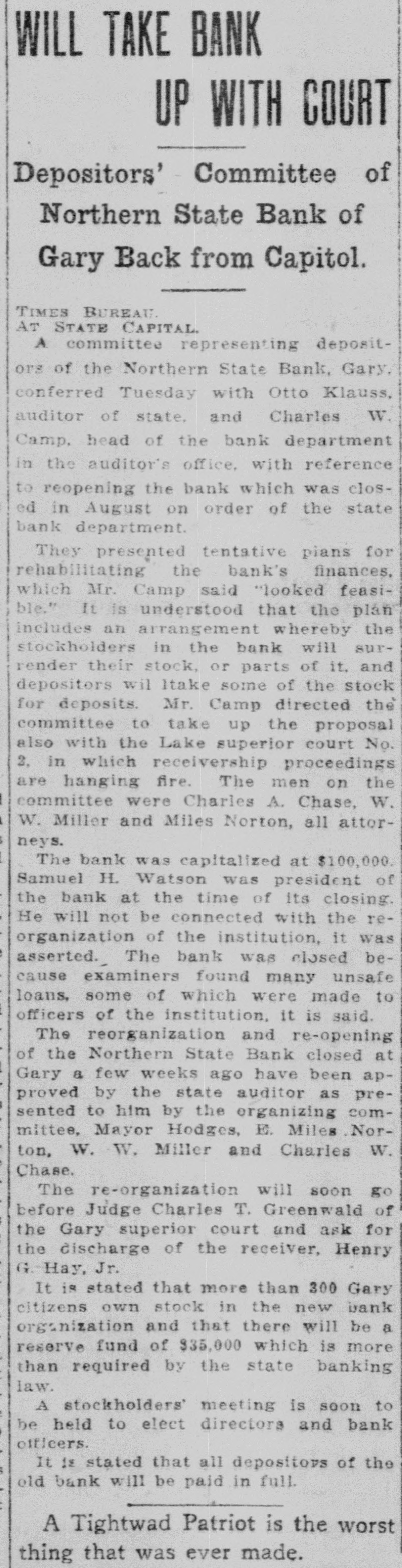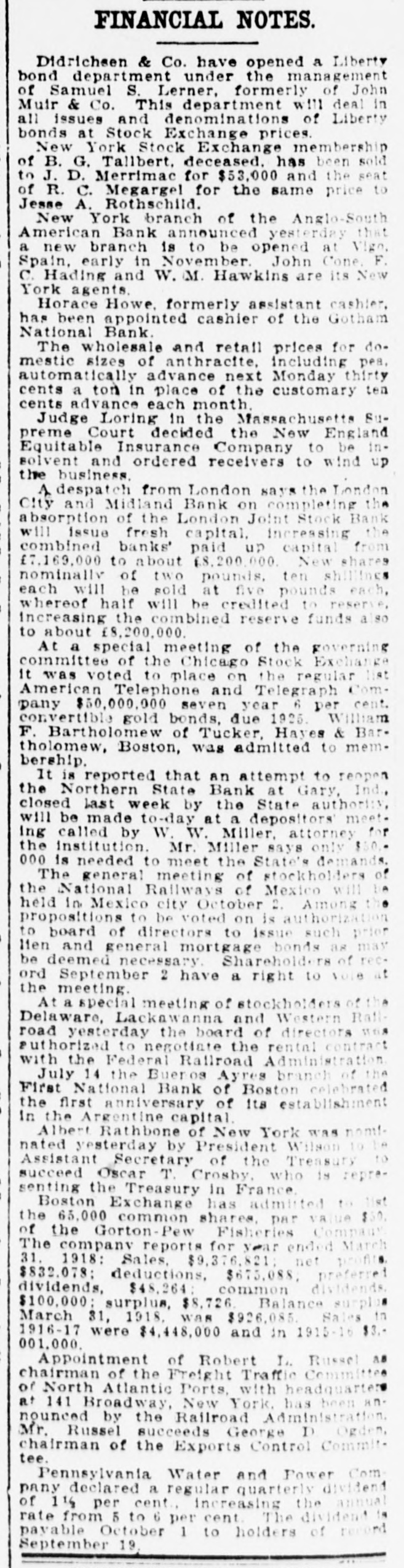 FINANCIAL NOTES. Didricheen & Co. have opened a Liberty bond department under the management of Samuel S. Lerner, formerly of John Muir & Co. This department will deal in all issues and denominations of Liberty bonds at Stock Exchange prices. New York Stock Exchange membership of B. G. Tallbert. deceased. has been sold to J. D. Merrimac for $53,000 and the seat of R. C. Megargel for the same price to Jesse A. Rothschild. New York branch of the Anglo-South American Bank announced yesterday that a new branch is to be opened at Vigo, Spain, early in November John Cone. F. C. Hading and W. M. Hawkins are its New York agents. Horace Howe, formerly assistant cashier. has been appointed cashier of the Gotham National Bank. The wholesale and retail prices for domestic sizes of anthracite, including pea, automatically advance next Monday thirty cents a ton in place of the customary ten cents advance each month. Judge Loring in the Massachusetts Supreme Court decided the New England Equitable Insurance Company to be insolvent and ordered receivers to wind up the business. A despatch from London says the London City and Midland Bank on completing the absorption of the London Joint Stock Bank will issue fresh capital. increasing the combined banks' paid up capital from £7,169,000 to about £8,200,000. New shares nominally of two pounds, ten shillings each will be sold at five pounds each, whereof half will be credited to reserve, increasing the combined reserve funds also to about £8,200,000. At a special meeting of the governing committee of the Chicago Stock Exchange it was voted to place on the regular list American Telephone and Telegraph Company $50,000.000 seven year 6 per cent. convertible gold bonds, due 1925. William F. Bartholomew of Tucker, Hayes & Bartholomew, Boston, was admitted to membership. It is reported that an attempt to reopen the Northern State Bank at Gary, Ind., closed last week by the State authority, will be made to-day at a depositors meet. Ing called by W. W. Miller, attorney for the institution. Mr. Miller says only $30.000 is needed to meet the State's demands. The general meeting of stockholders of the National Railways of Mexico will be held in Mexico city October 2. Among the propositions to be voted on is authorization to board of directors to issue such prior lien and general mortgage bonds as may be deemed necessary. Shareholders of rec. ord September 2 have a right to vote at the meeting. At a special meeting of stockholders of the Delaware, Lackawanna and Western Rallroad yesterday the board of directors Was authorized to negotiate the rental contract with the Federal Railroad Administration July 14 the Buenos Ayres branch of the First National Bank of Boston celebrated the first anniversary of its establishment In the Argentine capital. Albert Rathbone of New York was nominated yesterday by President Wilson to Assistant Secretary of the Treasury to succeed Oscar T. Crosby. who is representing the Treasury in France Boston Exchange has admitted to list the 65,000 common shares, par value $50. of the Gorton-Pew Fisheries Company The company reports for year ended March 31. 1918: Sales, $9,376,821 net profits, $832.078; deductions, $675,088 preferred dividends, $48,264: common dividends $100,000: surplus, $8,726 Balance surplus March 31, 1918, was $926,085. Sales in 1916-17 were $4,448,000 and in 1915-16 $3.001,000. Appointment of Robert L. Russel AS chairman of the Freight Traffic Committee of North Atlantic Ports, with headquarter at 141 Broadway, New York. has been announced by the Railroad Administration. Mr. Russel succeeds George D Ogden, chairman of the Exports Control Committee. Pennsylvania Water and Power Com pany declared a regular quarterly dividend of 1½ per cent., increasing the annual rate from 5 to 6 per cent. The divident is payable October 1 to holders of record September 19,
