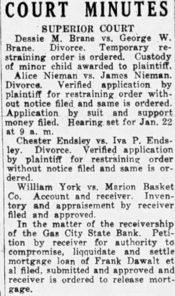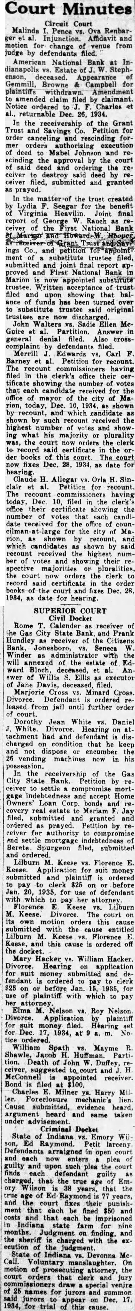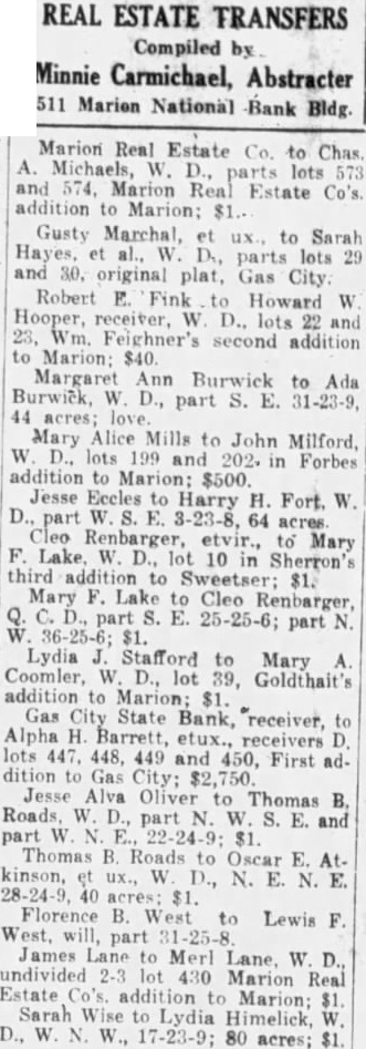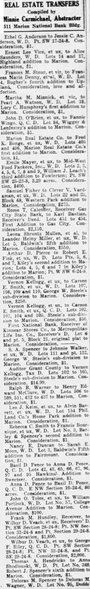 REAL ESTATE TRANSFERS Compiled by Minnie Carmichael, Abstracter 511 Marion National Bank Bldg. Ethel G. Anderson to Jessie C. AnW. D. Pt. SW 17-24-8. Conderson, sideration, $1. Lee Vice, et to Alice Ernest W. D. Lots 14 and 17, Saunders, addition to Marion. ConHighland sideration, $1. Frances M. Stour, et vir, to FranMarie Denny, W. D. Lot ces fourth addition to Up4, land, Consideration, love and affection. Martha M. Minnick, et vir, to Watson, W. D. Lot 18, Humphrey's first addition to Lucy C. Marion. John D. O'Brien, et ux, to Fannie Lot 84, Wigger & Wingo, Q. C. addition to Marion. ConLenfestey's sideration, $1. Marion Real Estate Co. to Fred W. D. Lots 405 K. Bonge, et ux, Real Estate Co.'s and Marion Marion. Considerafirst addition to tion, $1. Mayer, et ux, to Emile Inc., W. D. Lots 3, Food and William J. 4,5,6, third addition to Fowlerton; Pt. SW SW 25-23-8, 3.29 acres. Consideration, $400. Fisher to Clever VardSamuel W. D. Lots 22 and et ux, aman, Block 68, Western Park addition to Marion. $275. Rome T. Calender. Receiver Gas State Bank, to Karl City Deed. Lots 451 to 454, Receiver's Addition to Gas City. ConFirst $2,150. Shrontz Mullen, et al, to Leona Miller, et W. D. Leander Heiny ux, Baldwin's fifth addition to Lot 5, Marion. Consideration. D. Pierce to Robert E. Arthur W. D. Lots Pts. 5, Fink, ux, second addition to Ma and Kiley's and in Kiley's Lots 5, addition rion; to Marion; Pt. W SW 6-24-8. Consideration, $1. et to Carson Vernon ux, W. D. Lots 107, E. Smith, et George W. Steele's 108, 109 and sub-division to Marion. Consideration, $250. Vernon Kellogg, et ux, to Lots Carson 102, E. et C. ux, 103, 104 and 105, Steele's sion to Marion. Bank, Receiver of First National Kinnear Stores Co., to Metropolitan Receiver's D. Lot Life Ins. Co., Block 21, original plat to and pt. Marion. Johnnie Walker, Spencer to S. Lots 111 and pt. et W. D. George ux, W. Steele's sub-division to Consideration, $1. Marion. Auditor Grant County to Vernon Lots 102 to 105, Tax D. to Marion. ConSteele's sub-division $14.99. EdB. Warner to Henry Ralph W. D. Lots 506 to ward McClure, 437 to Con511, 432 to $1. et to Alvin Leo J. Keim, ux, W. D. Lot 154 rett, et ux, addition to Co.'s Home Park Land Consideration, $1. Marion. Rebecca C. Smith to Francis BourLot No. Baret W. D. nique, second addition to ley & Spencer's Marion. Consideration, Duncan to Sarah Nancy E. Lot Baldwin's Fifth W. D. addition to Fairmount. tion, $1. Basil D. Pence to Anna D. Pence, Lots 66. Q. C. D. Addition and 95 $1. Sweetser. Anna D. Pence to Basil D. Pence 80 E NW Section 10-24-6, Q. D. Consideration, $1. acres. to William John O. Toles, et ux, W.D. Lot No. College to Marion. ConAvenue Addition sideration, $100. Frank M. Hundley, Receiver, D. to ux, Receivers' Wilbur D. Pt. NW Pt. SW Section Section 29-24-8. tion 33-24-8 and Consideration, $1,800. D. Veach, et ux, to George Wilbur D. Pt. SW Section F. Riley, Q. C. 33-24-8, and Pt. 28-24-8; Pt. NW $2,000. SE Hendricks to Anna Thomas W. D. Pt. Lot No. Shodlouski, Robert J. Spencer's sixth addition to Marion. Consideration, $1. to Deloras M. Deloras M. Spencer W. D. Lot No. 95, Wagner,
