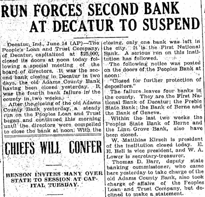 BANK FORCES SECOND RUN SUSPEND DECATUR TO AT and Trust Company, Decatur, capitalized doors at noon today closed the special meeting lowing directors. was the board In Decatur two bank closing Adams County Bank old having been closed yesterday. bank failure the the fourth was county of the old Adams Bank yesterday, steady Loan and Trust the Peoples continued this morning directors were compelled the bank noon. With the close the bank loft only the First city. serious run on this Bank. has was posted The Peoples Bank on the doors noon: for further protection of "Closed leaves four banks The are the First Nathe county. They tional Bank Decatur: the the Bank of Berne and State the Bank of Geneva. the two weeks the Within State Bank Berne and Peoples Grove Bank, also have the Linn been closed. Matthias Kirsch is president institution closed E. the Bell vice president, and Lower D. Barr, deputy state Thomas commissioner, who came banking charge of the here yesterday to Bank, also took old Adams County affairs the Feoples charge Loan and Trust Company. but declined to make statement.