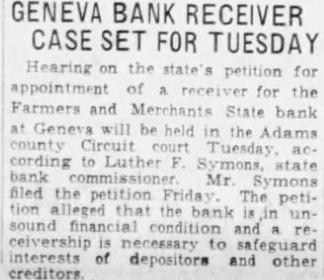 GENEVA BANK RECEIVER CASE SET FOR TUESDAY Hearing on the state's petition for appointment of for the Farmers and Merchants State bank at Geneva will be held in the Adams county Circuit Tuesday cording to Luther state bank Mr. Symons filed the petition Friday. The petition alleged that the bank unsound financial condition and is necessary to safeguard interests of depositors and other creditors