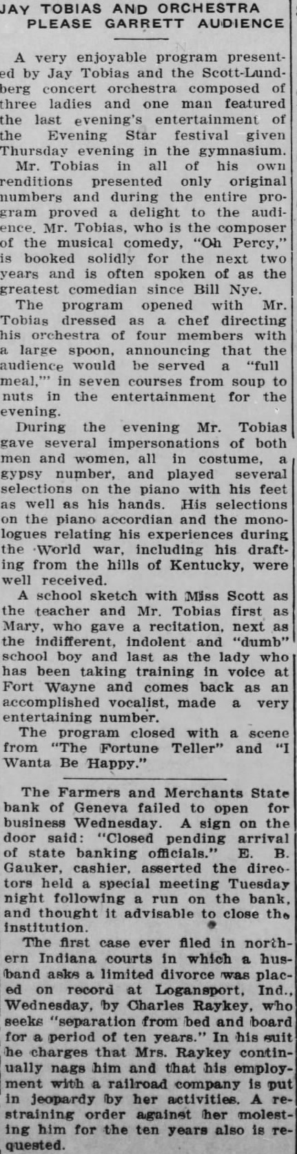 JAY TOBIAS AND ORCHESTRA PLEASE GARRETT AUDIENCE very enjoyable program presentby Jay Tobias and the berg concert orchestra composed three ladies and one man featured the last evening's of the Evening Star festival given Thursday evening the gymnasium. Mr. Tobias in all his renditions presented only original numbers during the entire gram proved delight to the audiTobias, who the composer the musical comedy, Percy," booked solidly the next years is often spoken of the greatest comedian since Bill Nye. The program opened with Mr. Tobias dressed chef directing orchestra of four members with large spoon, announcing that the audience would served "full in courses from the for the evening. During the evening Mr. Tobias gave several of both men and women, all in costume, number, and played several selections the piano with his feet well his hands. His selections the piano accordian and logues relating his experiences during World war, including his draftfrom the hills of Kentucky, received. school sketch with Miss Scott the teacher and Mr. Tobias first Mary, who next as indifferent, indolent and school and last the lady been taking training in voice Wayne and comes back as an accomplished vocalist, made very entertaining number. The program closed with from Fortune Teller" and Wanta Be Happy."