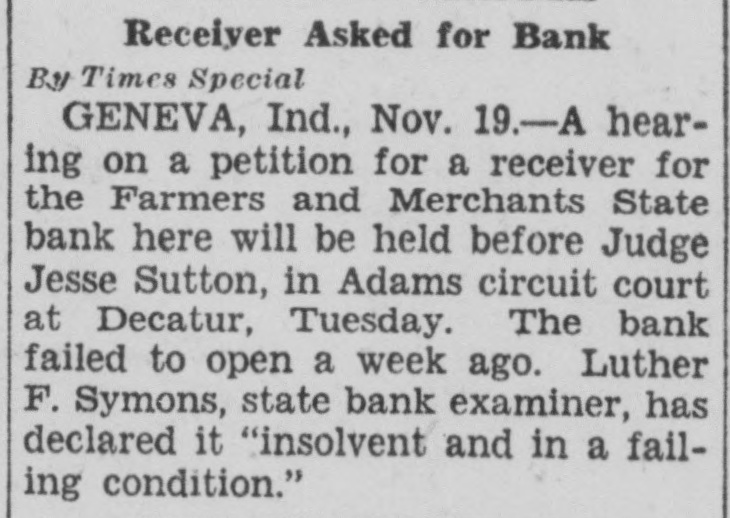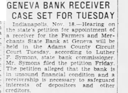 Indianapolis. Nov 18 -Hearing on the state's petition for appointment of receiver for the Farmers and Merchants State Bank at Geneva will be held in the Adams County Circuit Court Tuesday according to Luther Symons, state bank commissioner Mr. Symons filed the petition Friday The petition alleged that the bank is in unsound financial condition and a receivership to safeguard interests of depositors and other
