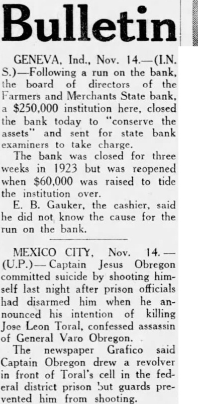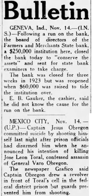 GENEVA, Ind., Nov. (I.N. Following run on the bank, the board of directors of the Farmers and Merchants State bank. $250,000 institution here, closed the bank today to "conserve the assets and sent for state bank examiners to take charge. The bank was closed for three weeks in 1923 but was reopened when $60,000 was raised to tide the institution over. E. B. Gauker, the cashier, said he did not know the cause for the run on the bank.