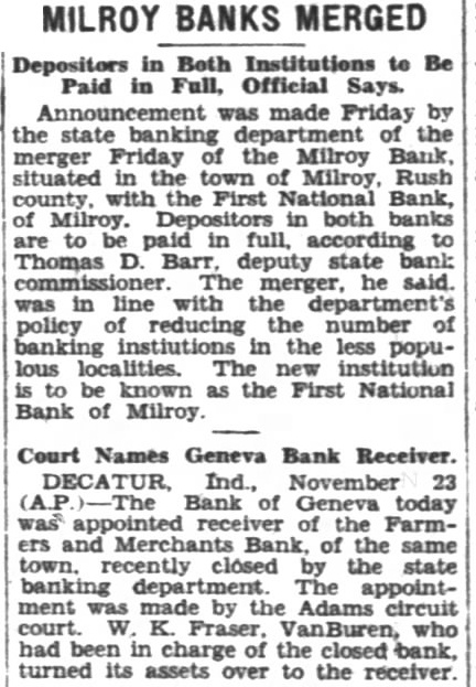 Depositors in Both Institutions to Be Paid Full, Official Says. Announcement made Friday by the state banking the merger Friday the Milroy situated Milroy Rush the First Bank, of both banks are to be in full, Thomas D. Barr, deputy he in line with the department's policy reducing number the less popuknown as the First National Bank of Milroy