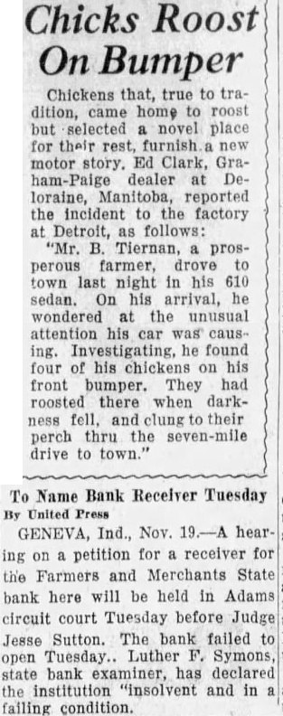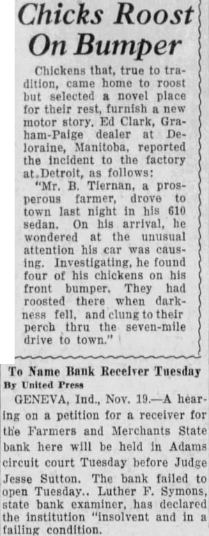 Chickens that, true to tradition, came home to roost but selected a novel place for their rest, furnish. new motor story. Ed Clark, Graham-Paige dealer at Deloraine, Manitoba, reported the incident to the factory at Detroit, as follows: "Mr. B. Tiernan, a prosperous farmer, drove to town last night in his 610 sedan. On his arrival, he wondered at the unusual attention his car was causing. Investigating, he found four of his chickens on his front bumper. They had roosted there when darkness fell, and clung their perch thru the seven-mile drive to town."
