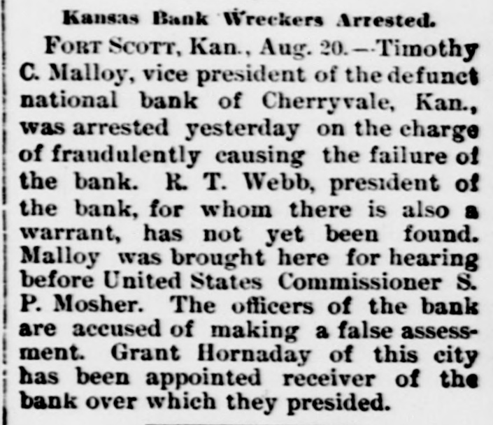 Kansas Bank Wreckers Arrested. FORT SCOTT, Kan., Aug. 20.-Timothy C. Malloy, vice president of the defunct national bank of Cherryvale, Kan., was arrested yesterday on the charge of fraudulently causing the failure of the bank. R. T. Webb, president of the bank, for whom there is also a warrant, has not yet been found. Malloy was brought here for hearing before United States Commissioner S. P. Mosher. The officers of the bank are accused of making a false assessment. Grant Hornaday of this city has been appointed receiver of the bank over which they presided.