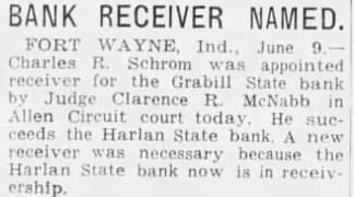 BANK RECEIVER NAMED. Fort Wayne, Ind., June 9. Charles R. Schrom was appointed receiver for the Grabill State bank by Judge Clarence R. MeNabb in Allen Circuit court today. He succeeds the Harlan State bank. A new receiver was necessary because the Harlan