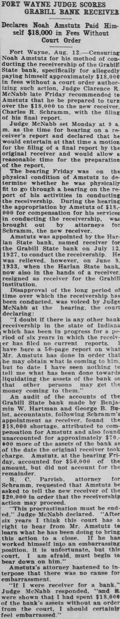 FORT WAYNE JUDGE SCORES GRABILL BANK RECEIVER Declares Noah Amstutz Paid $18,000 in Fees Without Court Order Fort Wayne, Aug. Noah Amstutz for his method of ducting the of the State bank, specifically for allegedly paying himself fees without court order authorizing action, Judge Clarence McNabb late Friday recommended Amstutz that he be prepared to turn to the new Charles Schramm, with the filing his final report. Judge McNabb set Monday the time for hearing ceiver's report and declared that would entertain at that time motion for filing of final report by the original receiver and would allow time for the preparation of the report. The bearing Friday was on the physical condition of Amstutz termine whether was physically to through hearing the activities conducting the receivership. During hearing the appropriation by Amstutz of for his conducting the receivership, was brought out attorneys for new Amstutz appointed the Harlan State bank. named receiver for the Grabill State on July He relieved. however, June 1933. when the Harlan State bank, now in the hands of receiver resigned receiver for the Grabill institution. Disapproval the long period of time which been conducted. voiced by Judge McNabb at the hearing. the court declaring: doubt there is any other bank in state of Indiana which has been in progress riod of which the receivhas filed current reports. here what Amstutz has done in order that obtain to date have what has done assets the bank that other may get the money coming to An audit of the accounts of the Grabill State bank made by and Bureceiver. found the to for and for more of the assets of the bank the the original took charge. at the hearing Frifor the amount. but did not account for the attorney for that asked tell the of the order that the action may proceed. must be endJudge McNabb think this court has right hear from Mr. Amstutz what he has doing bring this action close. has worked position. but this am must begin down on hastened to that there was no cause for receiver for bank." Judge McNabb responded, that spent the order from the court. should certainly feel