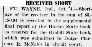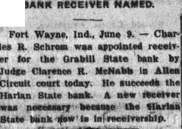 BANK RECEIVER NAMED. FORT WAYNE. June R. for the Grabill Clarence R. McNabb Allen Circuit court today He ceeds the Harlan State bank. receiver was necessary because the State bank now is in ership.