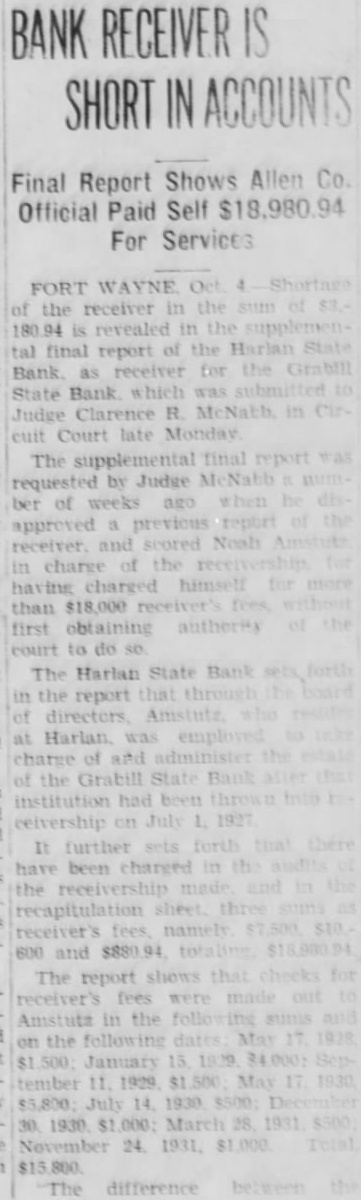 BANK RECEIVER IS SHORT IN ACCOUNTS Final Report Shows Allen Co. Official Paid Self $18,980.94 For Services WAYNE Oct in the sum revealed in the of the Harlan State report Bank as receiver for the Grabill State Bank which was submitted cuit Court late Monday supplemental final report requested by Judge McNabb when approved previous report in charge of the having charged himself than $18,000 receiver first obtaining authority The Harlan State Bank in the report that through directors Amstutz charge of and administer State Bank institution had been have been charged in sheet three receiver's fees namely $880.94 shows that fees were made out the following May January 15 1929 May $5,800 July 14. 1930 $500 March 28 1931 difference
