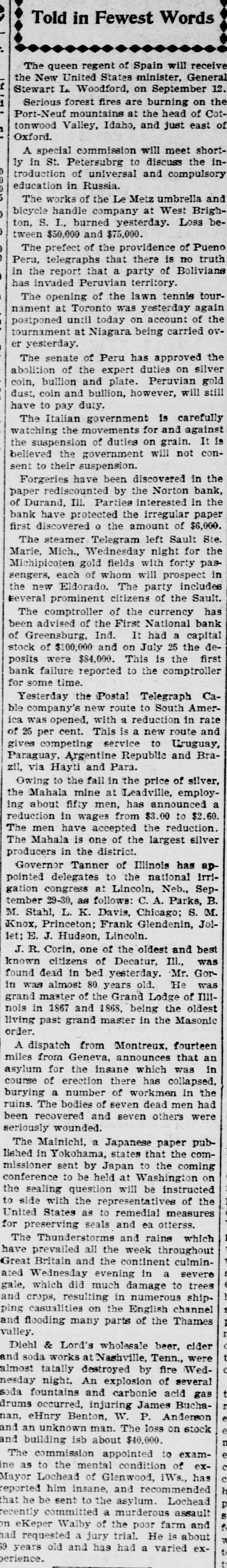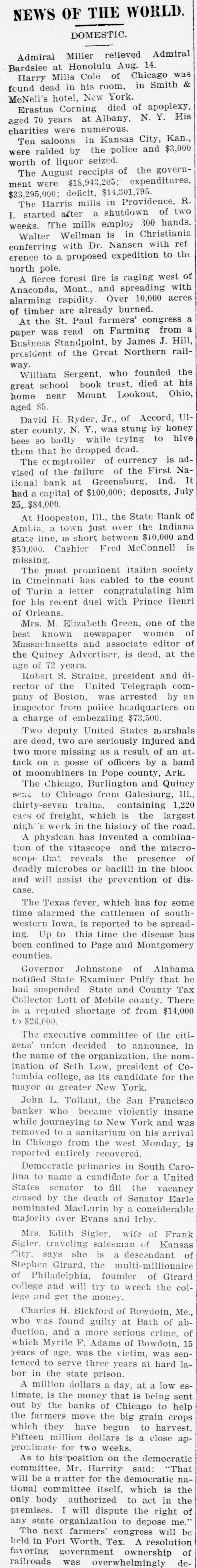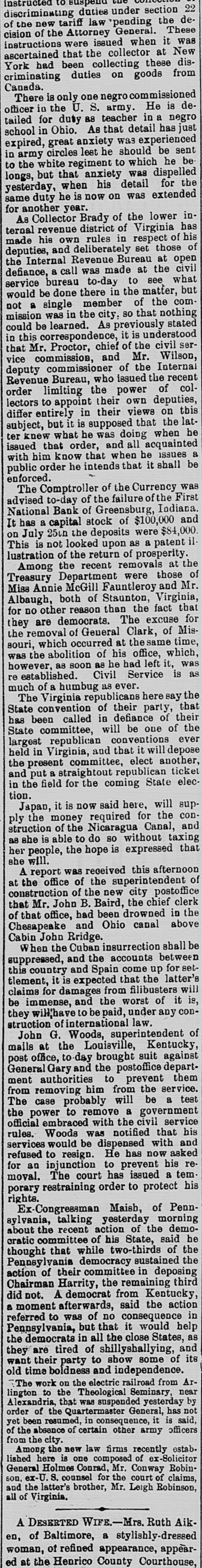 instructed discriminating duties under section 22 of the new tariff law 'pending the decision of the Attorney General. These instructions were issued when it was ascertained that the collector at New York had been collecting these discriminating duties on goods from Canada. There is only one negro commissioned officer in the U. S. army. He is detailed for duty as teacher in a negro school in Ohio. As that detail has just expired, great anxiety was experienced in army circles lest he should be sent to the white regiment to which he be longs, but that anxiety was dispelled yesterday, when his detail for the same duty he is now on was extended for another year. As Collector Brady of the lower internal revenue district of Virginia has made his own rules in respect of his deputies, and deliberately set those of the Internal Revenue Bureau at open defiance, 8 call was made at the civil service bureau to-day to see what would be done there in the matter, but not a single member of the commission was in the city, so that nothing could be learned. As previously stated in this correspondence, it is understood that Mr. Proctor, chief of the civil service commission, and Mr. Wilson, deputy commissioner of the Internal Revenue Bureau, who issued the recent order limiting the power of collectors to appoint their own deputies, differ entirely in their views on this subject, but it is supposed that the latter knew what he was doing when he issued that order, and all acquainted with him know that when he issues & public order he intends that it shall be enforced. The Comptroller of the Currency was advised to-day of the failure of the First National Bank of Greensburg, Indiana. It has a capital stock of $100,000 and on July 25th the deposits were $84,000. This is not looked upon as a patent il lustration of the return of prosperity. Among the recent removals at the Treasury Department were those of Miss Annie McGill Fauntleroy and Mr. Albaugh, both of Staunton, Virginia, for no other reason than the fact that they are democrats. The excuse for the removal of General Clark, of Missouri, which occurred at thesame time, was the abolition of his office, which, however, as soon as he had left it, was re established. Civil Service is as much of a humbug as ever. The Virginia republicans here say the State convention of their party, that has been called in defiance of their State committee, will be one of the largest republican conventions ever held in Virginia, and that it will depose the present committee, elect another, and put a straightout republican ticket in the field for the coming State election. Japan, it is now said here, will supply the money required for the construction of the Nicaragua Canal, and as she is able to do so without taxing her people, the hope is expressed that she will. A report was received this afternoon at the office of the superintendent of construction of the new city postoffice that Mr. John B. Baird, the chief clerk of that office, had been drowned in the Chesapeake and Ohio canal above Cabin John Rridge. When the Cuban insurrection shall be suppressed, and the accounts between this country and Spain come up for settlement, it is expected that the latter's claims for damages from filibusters will be immense, and the worst of it is, they will'have to be paid, under any construction of international law. John G. Woods, superintendent of mails at the Louisville, Kentucky, post office, to day brought suit against General Gary and the postoffice department authorities to prevent them from removing him from the service. The case probably will be a test the power to remove a government official embraced with the civil service rules. Woods was notified that his services would be dispensed with and refused to resign. He has now asked for an injunction to prevent his removal. The court has issued a tem porary restraining order to protect his rights. Ex-Congressman Maish, of Pennsylvania, talking yesterday morning about the recent action of the democratic committee of his State, said he thought that while two-thirds of the Pennsylvania democracy sustained the action of their committee in deposing Chairman Harrity, the remaining third did not. A democrat from Kentucky, a moment afterwards, said the action referred to was of no consequence in Pennsylvania, but that it would help the democrats in all the close States, as they are tired of shillyshallying, and want their party to show some of its old time boldness and independence. The work on the electric railroad from Arlington to the Theological Seminary, near Alexandria, that was suspended yesterday by order of the Quartermaster General, has not yet been resumed, in consequence, it is said, of the absence of certain other army officers from the city. Among the new law firms recently estab. lished here is one composed of ex-Solicitor General Holmes Conrad, Mr. Conway Robinson, ex-U. S. counsel for the court of claims, and the latter's brother, Mr. Leigh Robinson, all of Virginia. A DESERTED WIFE.-Mrs. Ruth Aiken, of Baltimore, a stylishly-dressed woman, of refined appearance, appeared at the Henrico County Courthouse,