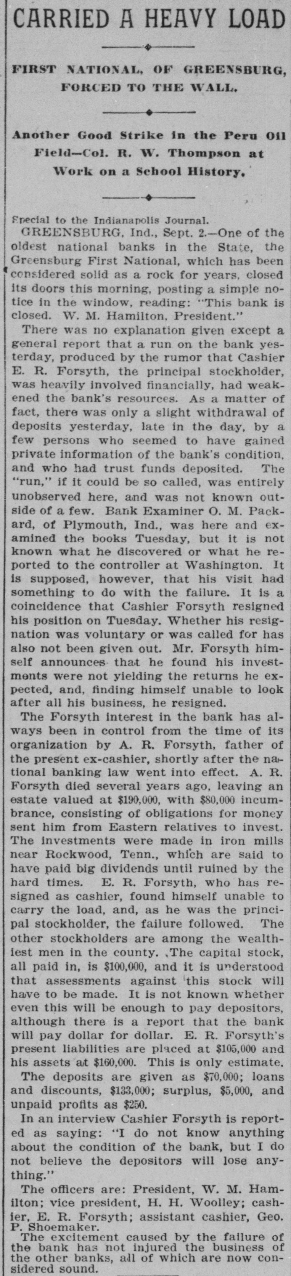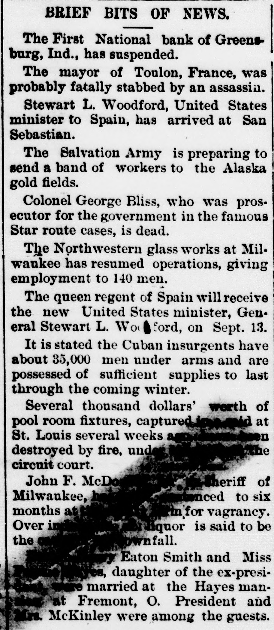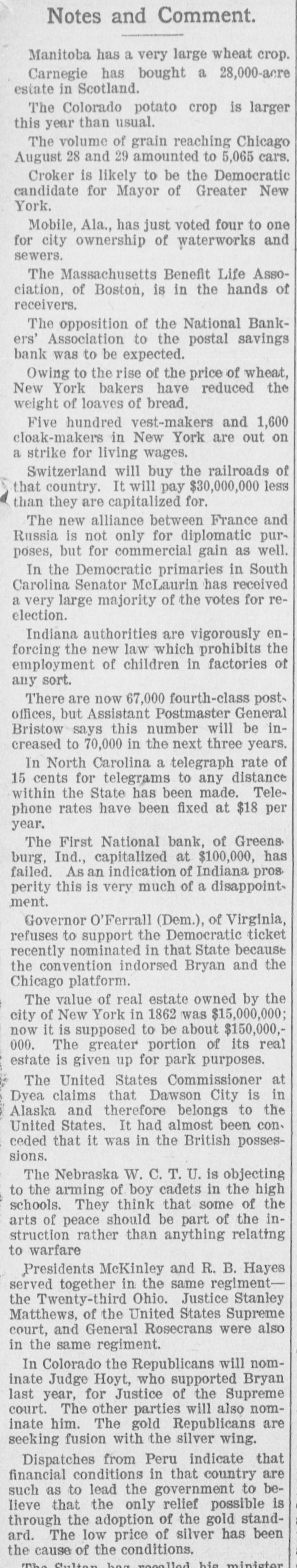 instructed discriminating duties under section 22 of the new tariff law 'pending the decision of the Attorney General. These instructions were issued when it was ascertained that the collector at New York had been collecting these discriminating duties on goods from Canada. There is only one negro commissioned officer in the U. S. army. He is detailed for duty as teacher in a negro school in Ohio. As that detail has just expired, great anxiety was experienced in army circles lest he should be sent to the white regiment to which he be longs, but that anxiety was dispelled yesterday, when his detail for the same duty he is now on was extended for another year. As Collector Brady of the lower internal revenue district of Virginia has made his own rules in respect of his deputies, and deliberately set those of the Internal Revenue Bureau at open defiance, 8 call was made at the civil service bureau to-day to see what would be done there in the matter, but not a single member of the commission was in the city, so that nothing could be learned. As previously stated in this correspondence, it is understood that Mr. Proctor, chief of the civil service commission, and Mr. Wilson, deputy commissioner of the Internal Revenue Bureau, who issued the recent order limiting the power of collectors to appoint their own deputies, differ entirely in their views on this subject, but it is supposed that the latter knew what he was doing when he issued that order, and all acquainted with him know that when he issues & public order he intends that it shall be enforced. The Comptroller of the Currency was advised to-day of the failure of the First National Bank of Greensburg, Indiana. It has a capital stock of $100,000 and on July 25th the deposits were $84,000. This is not looked upon as a patent il lustration of the return of prosperity. Among the recent removals at the Treasury Department were those of Miss Annie McGill Fauntleroy and Mr. Albaugh, both of Staunton, Virginia, for no other reason than the fact that they are democrats. The excuse for the removal of General Clark, of Missouri, which occurred at thesame time, was the abolition of his office, which, however, as soon as he had left it, was re established. Civil Service is as much of a humbug as ever. The Virginia republicans here say the State convention of their party, that has been called in defiance of their State committee, will be one of the largest republican conventions ever held in Virginia, and that it will depose the present committee, elect another, and put a straightout republican ticket in the field for the coming State election. Japan, it is now said here, will supply the money required for the construction of the Nicaragua Canal, and as she is able to do so without taxing her people, the hope is expressed that she will. A report was received this afternoon at the office of the superintendent of construction of the new city postoffice that Mr. John B. Baird, the chief clerk of that office, had been drowned in the Chesapeake and Ohio canal above Cabin John Rridge. When the Cuban insurrection shall be suppressed, and the accounts between this country and Spain come up for settlement, it is expected that the latter's claims for damages from filibusters will be immense, and the worst of it is, they will'have to be paid, under any construction of international law. John G. Woods, superintendent of mails at the Louisville, Kentucky, post office, to day brought suit against General Gary and the postoffice department authorities to prevent them from removing him from the service. The case probably will be a test the power to remove a government official embraced with the civil service rules. Woods was notified that his services would be dispensed with and refused to resign. He has now asked for an injunction to prevent his removal. The court has issued a tem porary restraining order to protect his rights. Ex-Congressman Maish, of Pennsylvania, talking yesterday morning about the recent action of the democratic committee of his State, said he thought that while two-thirds of the Pennsylvania democracy sustained the action of their committee in deposing Chairman Harrity, the remaining third did not. A democrat from Kentucky, a moment afterwards, said the action referred to was of no consequence in Pennsylvania, but that it would help the democrats in all the close States, as they are tired of shillyshallying, and want their party to show some of its old time boldness and independence. The work on the electric railroad from Arlington to the Theological Seminary, near Alexandria, that was suspended yesterday by order of the Quartermaster General, has not yet been resumed, in consequence, it is said, of the absence of certain other army officers from the city. Among the new law firms recently estab. lished here is one composed of ex-Solicitor General Holmes Conrad, Mr. Conway Robinson, ex-U. S. counsel for the court of claims, and the latter's brother, Mr. Leigh Robinson, all of Virginia. A DESERTED WIFE.-Mrs. Ruth Aiken, of Baltimore, a stylishly-dressed woman, of refined appearance, appeared at the Henrico County Courthouse,