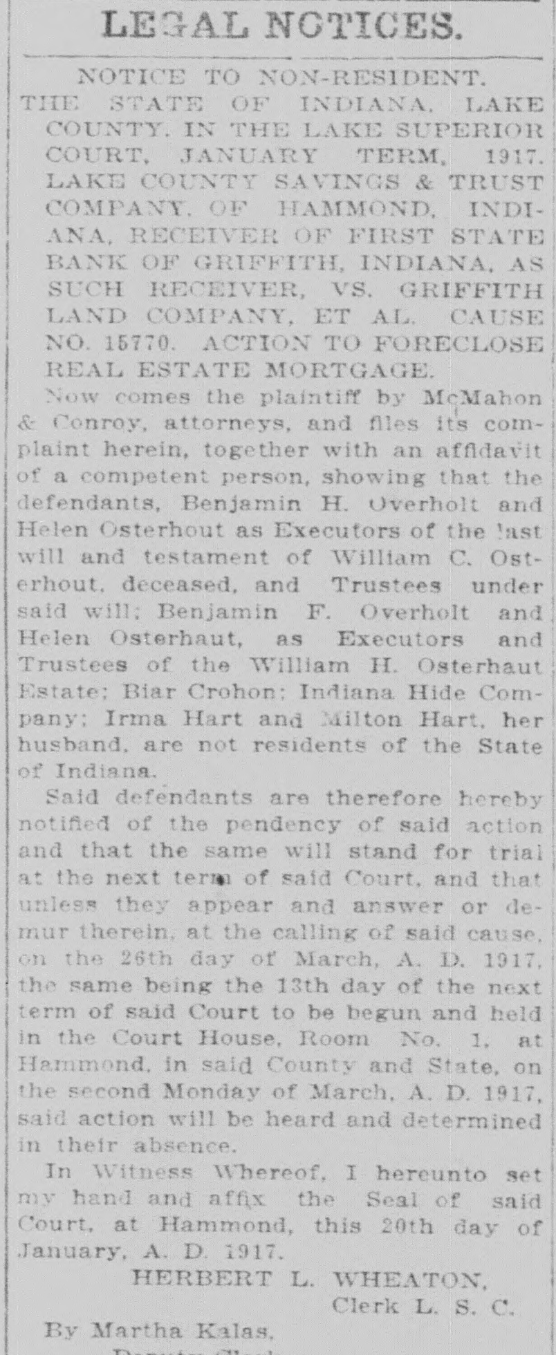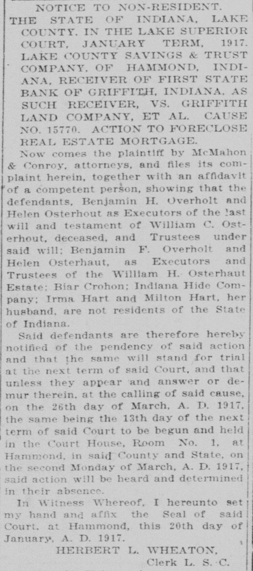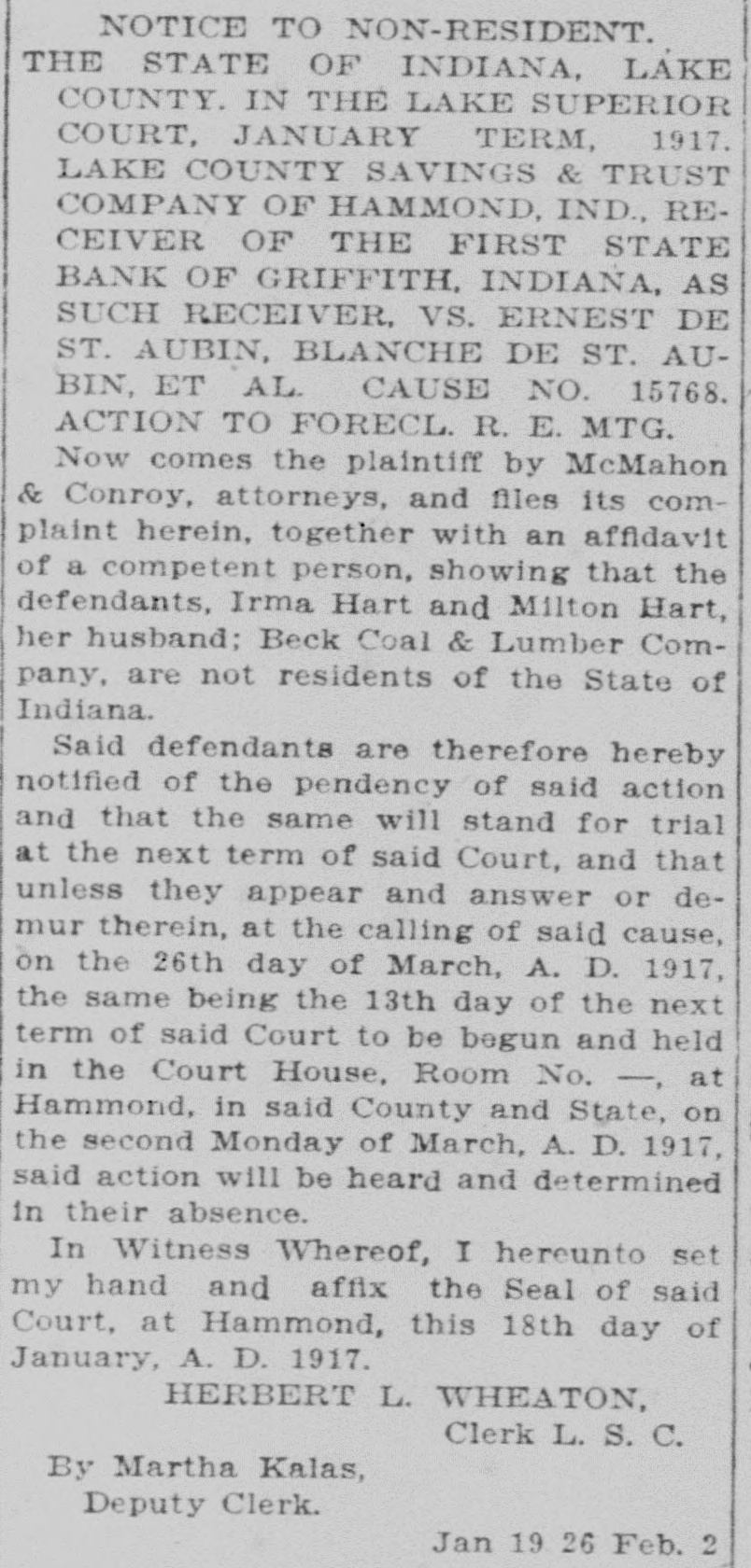 NOTICE TO NON-RESIDENT. THE STATE OF INDIANA, LAKE COUNTY. IN THE LAKE SUPERIOR COURT, JANUARY TERM, 1917. LAKE COUNTY SAVINGS & TRUST COMPANY OF HAMMOND, IND., RECEIVER OF THE FIRST STATE BANK OF GRIFFITH, INDIANA, AS SUCH RECEIVER, VS. ERNEST DE ST. AUBIN, BLANCHE DE ST. AUBIN, ET AL. CAUSE NO. 15768. ACTION TO FORECL. R. E. MTG. Now comes the plaintiff by McMahon & Conroy, attorneys, and files its complaint herein, together with an affidavit of a competent person, showing that the defendants, Irma Hart and Milton Hart, her husband; Beck Coal & Lumber Company, are not residents of the State of Indiana. Said defendants are therefore hereby notified of the pendency of said action and that the same will stand for trial at the next term of said Court, and that unless they appear and answer or demur therein, at the calling of said cause, on the 26th day of March, A. D. 1917, the same being the 13th day of the next term of said Court to be begun and held in the Court House, Room No. -, at Hammond. in said County and State, on the second Monday of March, A. D. 1917, said action will be heard and determined in their absence. In Witness Whereof, I hereunto set my hand and affix the Seal of said Court, at Hammond, this 18th day of January, A. D. 1917. HERBERT L. WHEATON, Clerk L. S. C. By Martha Kalas, Deputy Clerk. Jan 19 26 Feb. 2 PETITION OF BANKRUPT FOR DISCHARGE. IN THE MATTER OF FRED S. USHER, BANKRUPT. NO. 229. IN BANKRUPTCY. District of Indiana, SS: On this 31st day of January, A. D. 1917, on reading the petition of the bankrupt for his discharge, It is ordered by the Court, that a