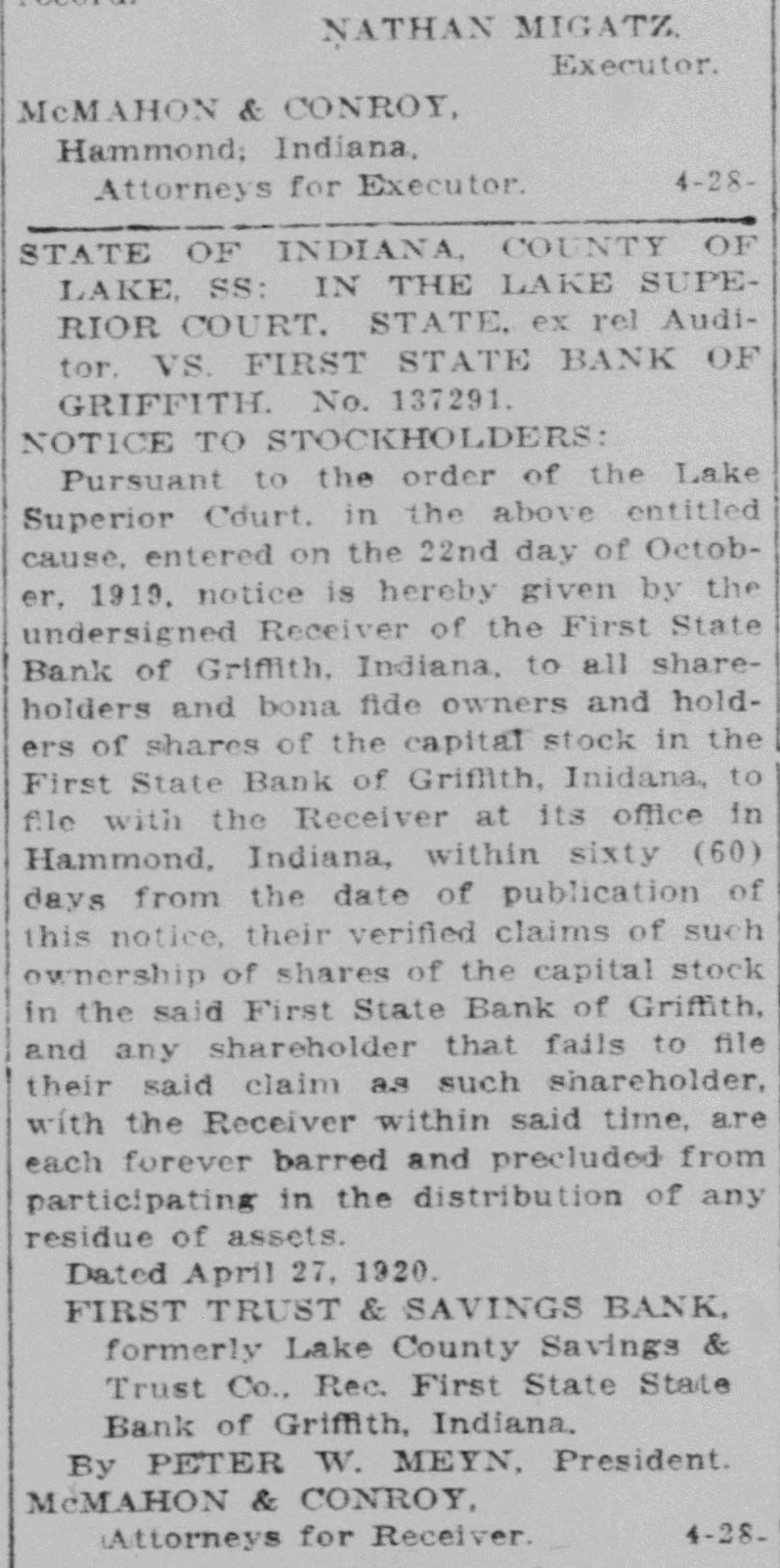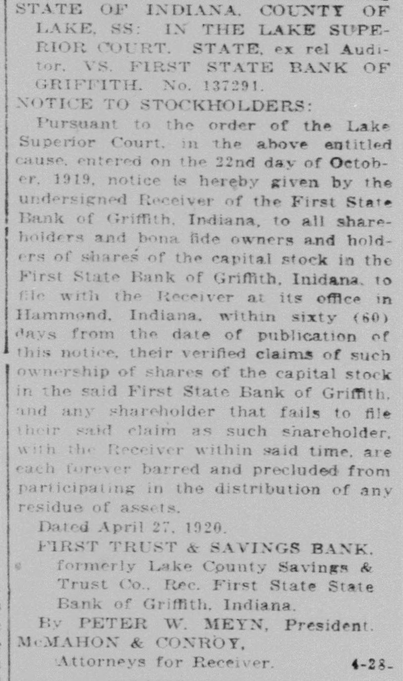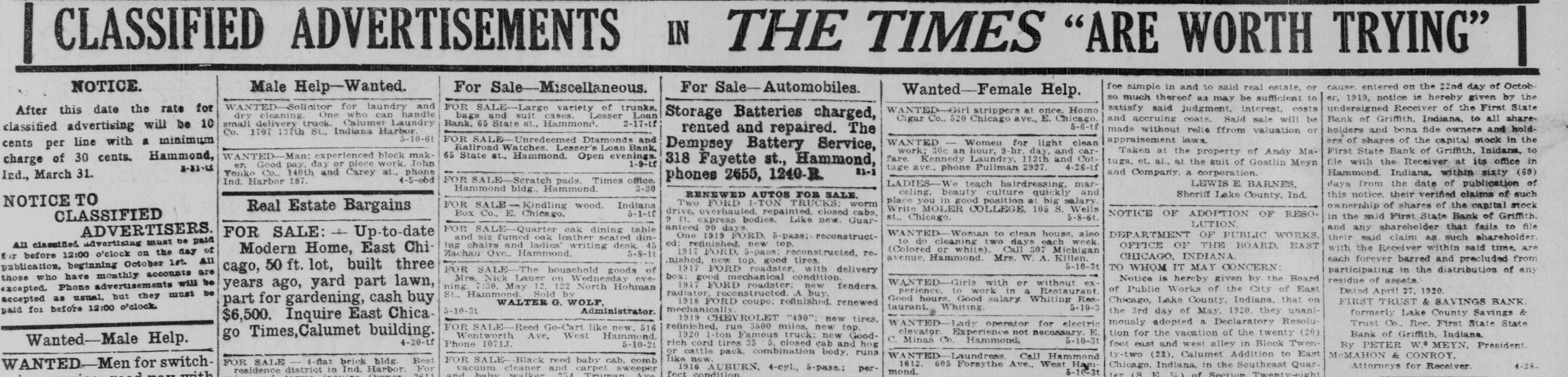 IN CLASSIFIED ADVERTISEMENTS THE TIMES "ARE WORTH TRYING" cause entered on the 22nd day of Octobfee simple in and to said real estate, or NOTICE. For Sale-Miscellaneous. For Sale-Automobiles. Male Help-Wanted. Wanted-Female Help. so much thereof as may be sufficient to er, 1919, notice is hereby given by the WANTED-Solicitor for laundry and FOR SALE-Large variety of trunks, satisfy said judgment. interest, costs undersigned Receiver of the First State WANTED strippers at once. Homo After this date the rate for bags and suit cases. Lesser Loan dry cleaning. One who can handle Storage Batteries charged, Bank of Griffith, Indiana, to all shareand accruing costs. Said sale will be Cigar Co., 520 Chicago ave., E. Chicago. Bank. 65 State st., Hammond. 2-17-tf small delivery truck. Calumet Laundry 5-6-tf classified advertising will be 10 made without relie ffrom valuation or holders and bona fide owners and holdrented and repaired. The Co. 1707 137th St., Indiana Harbor 5-10-6t FOR SALE-Unredeemed Diamonds and appraisement laws. ers of shares of the capital stock in the WANTED - Women for light clean cents per line with a minimum Dempsey Battery Service, Railroad Watches. Lesser's Loan Bank, First State Bank of Griffith, Inidana, to work; 30c an hour, 9-hr. day, and carTaken at the property of Andy MaWANTED-Man: experienced block mak65 State st., Hammond. Open evenings. fare. Kennedy Laundry, 112th and Cotfile with the Receiver at its office in charge of 30 cents. Hammond, 318 Fayette st., Hammond, tuga, et. al., at the suit of Gostlin Meyn 1-9-tf er. Good pay, day or piece work. John tage ave., phone Pullman 2927. 4-26-tf 8-81-55 81-1 Hammond. Indiana, within sixty (60) Yonko Co., 140th and Carey st., phone and Company, a corporation. Ird., March 31. phones 2655, 1240-R. 4-5-ebd FOR SALE-Scratch pads. Times office. Ind. Harbor 187. days from the date of publication of LADIES-We teach hairdressing, marLEWIS E. BARNES, 3-30 Hammond bldg., Hammond. celing, beauty culture quickly and this notice, their verified claims of such RENEWED AUTOS FOR SALE. Sheriff Lake County, Ind. place you in good position a big salary. NOTICE TO Two FORD 1-TON TRUCKS: worm FOR SALE- Kindling wood. Indiana ownership of shares of the capital stock Write MOLER COLLEGE, 105 S. Wells Real Estate Bargains drive, overhauled, repainted. closed cabs, 5-1-tf NOTICE OF ADOPTION OF RESOBox Co., E. Chicago, in the said First State Bank of Griffith. 5-8-6t. st., Chicago. CLASSIFIED 9 ft. express bodies. Like new. GuarLUTION. and any shareholder that fails to file anteed 90 days. FOR SALE-Quarter oak dining table ADVERTISERS. WANTED- Woman to clean house, also DEPARTMENT OF PUBLIC WORKS. FOR SALE: Up-to-date One 1919 FORD. 5-pass; reconstructtheir said claim as such shareholder and siz fumed oak leather seated dinto do cleaning two days each week ed: refinished, new top. All classified advertising must be paid OFFICE OF THE BOARD, EAST ing chairs and ladies writing desk 45 with the Receiver within said time, are (Colored or white). Call 307 Michigan Modern Home, East Chi1917 FORD, 5-pass: reconstructed, reZachau Ove., Hammond. 5-8-11 for before 12:00 o'clock on the day of CHICAGO, INDIANA avenue, Hammond. Mrs. W. A. Killen. each forever barred and precluded from ,nished, new top. good tires. 5-10-3t TO WHOM IT MAY CONCERN: publication, beginning October 1st. All cago, 50 ft. lot, built three 1917 FORD roadster. with delivery participating in the distribution of any FOR SALE-The household goods of box: good mechanical condition those who have monthly accounts are Notice is hereby given by the Board Mrs. Nick Lauer on Wednesday everesidue of assets. WANTED-Girls with or without ex1917 FORD roadster: new fenders. years ago, yard part lawn, ning 7:30. May 12. 122 North Hohman of Public Works of the City of East excepted. Phone advertisements will be perience. to work in a Restaurant Dated April 27, 1920. radiator, reconstructed A buy. St., Hammond Sold by Good hours. Good salary Whiting Resaccepted as usual, but they must be Chicago, Lake County, Indiana, that on FIRST TRUST & SAVINGS BANK 1918 FORD coupe; refinished, renewed WALTER G. WOLF, part for gardening, cash buy 5-10-3 taurant. Whiting. mechanically 5-10-3t paid for before 12:00 o'clock the 3rd day of May. 1920. they unaniAdministrator. formerly Lake County Savings & $6,500. Inquire East Chica1919 CHEV ROLET "490": new tires, mously adopted a Declaratory ResoluTrust Co., Rec. First State State WANTED-Lady operator for electric FOR SALE-Reed Go-Cart like new. 516 refinished, run 3500 miles, new top. elevator Experience not necessary E. tion for the vacation of the twenty (20) Bank of Griffith. Indiana. 1920 1-ton Famous truck: new GoodWentworth Ave, West Hammond. go Times, Calumet building. C. Minas Co. Hammond. 5-10-3t 4-20-tf Wanted-Male Help. foot east and west alley in Block TwenPhone 1071J. rich cord tires 35 5. closed cab and hog 5-10-2t By PETER W. MEYN, President or cattle pack, combination body, runs ty-two (22), Calumet Addition to East McMAHON & CONROY. WANTED-Laundress. Call Hammond like new FOR SALE- Black reed baby cab. comb FOR SALE 4-flat brick bldg. Best 1612. 605 Forsythe Ave., West Ham Chicago, Indiana, in the Southeast Quar4-28Attorneys for Receiver. WANTED-Men for switch1916 AUBURN, 4-cyl., 5-pass.; pervacuum cleaner and carpet sweeper residence district in Ind. Harbor. For mond. 5-10-3t ter (S E 141 of Section Twentv-eight with 2611 and walker Truman fect condition