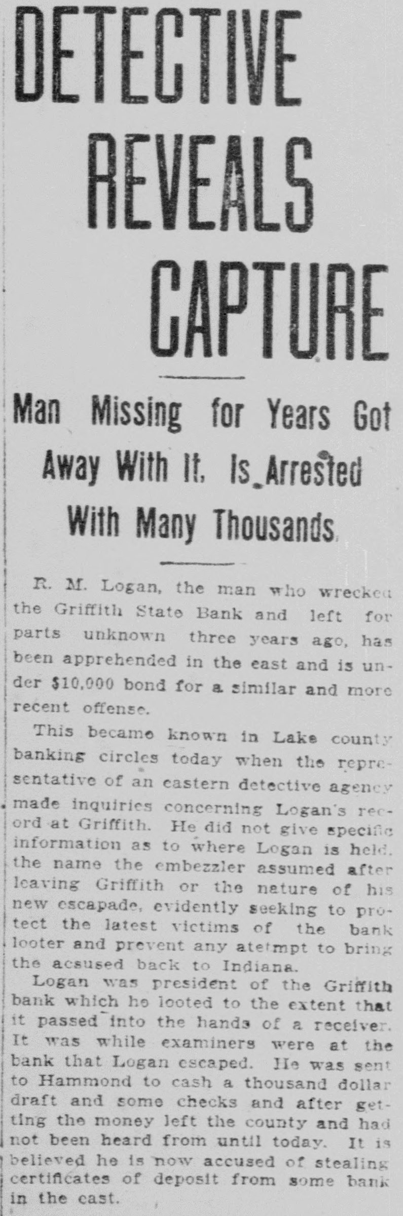 DETECTIVE REVEALS CAPTURE Man Missing for Years Got Away With If, Is_Arrested With Many Thousands R. M. Logan, the man who wrecked the Griffith State Bank and left for parts unknown three years ago, has been apprehended in the east and is under $10,000 bond for a similar and more recent offense. This became known in Lake county banking circles today when the representative of an eastern detective agency made inquiries concerning Logan's record at Griffith. He did not give specific information as to where Logan is held. the name the embezzler assumed after leaving Griffith or the nature of his new escapade, evidently seeking to protect the latest victims of the bank looter and prevent any atempt to bring the acsused back to Indiana. Logan was president of the Griffith bank which he looted to the extent that it passed into the hands of a receiver. It was while examiners were at the bank that Logan escaped. He was sent to Hammond to cash a thousand dollar draft and some checks and after getting the money left the county and had not been heard from until today. It is believed he is now accused of stealing certificates of deposit from some bank in the cast.