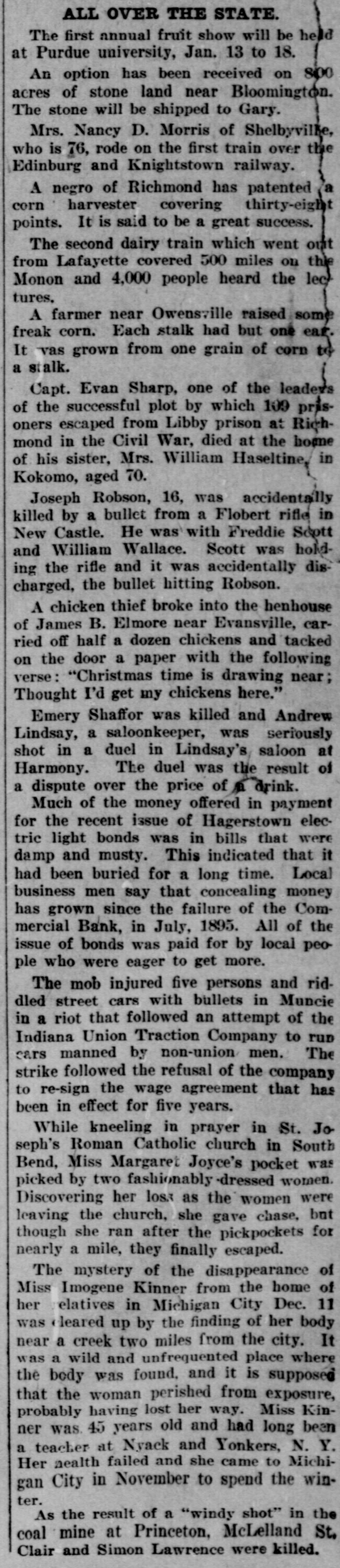 ALL OVER THE STATE. The first annual fruit show will be held at Purdue university, Jan. 13 to 18. An option has been received on 800 acres of stone land near Bloomington. The stone will be shipped to Gary. Mrs. Nancy D. Morris of Shelbyville, who is 76, rode on the first train over the Edinburg and Knightstown railway. A negro of Richmond has patented a corn harvester covering thirty-eight points. It is said to be a great success. The second dairy train which went out from Lafayette covered 500 miles on the Monon and 4,000 people heard the lec tures. A farmer near Owensville raised some freak corn. Each stalk had but one ear It vas grown from one grain of corn to a stalk. Capt. Evan Sharp, one of the leaders of the successful plot by which 109 prisoners escaped from Libby prison at Richmond in the Civil War, died at the home of his sister, Mrs. William Haseltine in Kokomo, aged 70. Joseph Robson, 16, was accidentall killed by a bullet from a Flobert rifle in New Castle. He was with Freddie Scott and William Wallace. Scott was hold ing the rifle and it was accidentally dis charged, the bullet hitting Robson. A chicken thief broke into the henhouse of James B. Elmore near Evansville, carried off half a dozen chickens and tacked on the door a paper with the following verse: "Christmas time is drawing near; Thought I'd get my chickens here." Emery Shaffor was killed and Andrew Lindsay, a saloonkeeper, was seriously shot in a duel in Lindsay's saloon at Harmony. The duel was the result of a dispute over the price of drink. Much of the money offered in payment for the recent issue of Hagerstown electric light bonds was in bills that were damp and musty. This indicated that it had been buried for a long time. Local business men say that concealing money has grown since the failure of the Commercial Bank, in July, 1895. All of the issue of bonds was paid for by local people who were eager to get more. The mob injured five persons and riddled street cars with bullets in Muncie in a riot that followed an attempt of the Indiana Union Traction Company to run cars manned by non-union men. The strike followed the refusal of the company to re-sign the wage agreement that has been in effect for five years. While kneeling in prayer in St. Jo. seph's Roman Catholic church in South Bend, Miss Margaret Joyce's pocket was picked by two fashionably dressed women. Discovering her loss as the women were leaving the church, she gave chase, but though she ran after the pickpockets for nearly a mile, they finally escaped. The mystery of the disappearance of Miss Imogene Kinner from the home of her elatives in Michigan City Dec. 11 was leared up by the finding of her body near a creek two miles from the city. It was a wild and unfrequented place where the body was found, and it is supposed that the woman perished from exposure, probably having lost her way. Miss Kinner was 45 years old and had long been a teacher at Nyack and Yonkers, N. Y. Her aealth failed and she came to Michigan City in November to spend the winter. As the result of a "windy shot" in the coal mine at Princeton, McLelland St. Clair and Simon Lawrence were killed.
