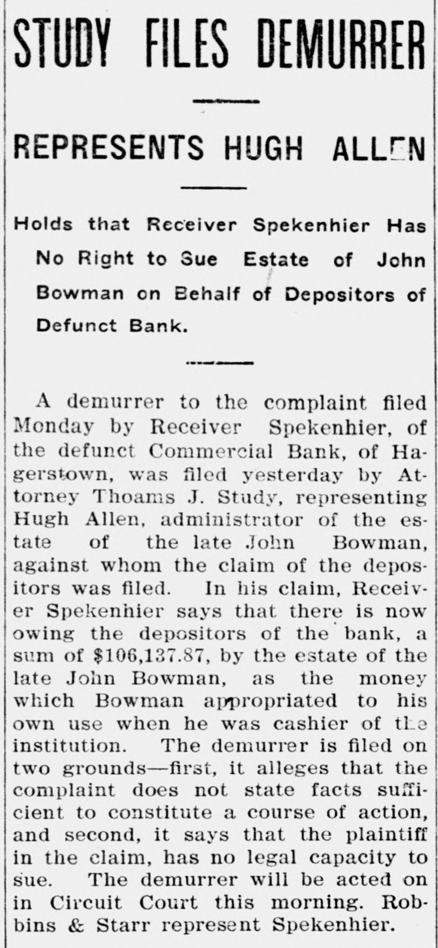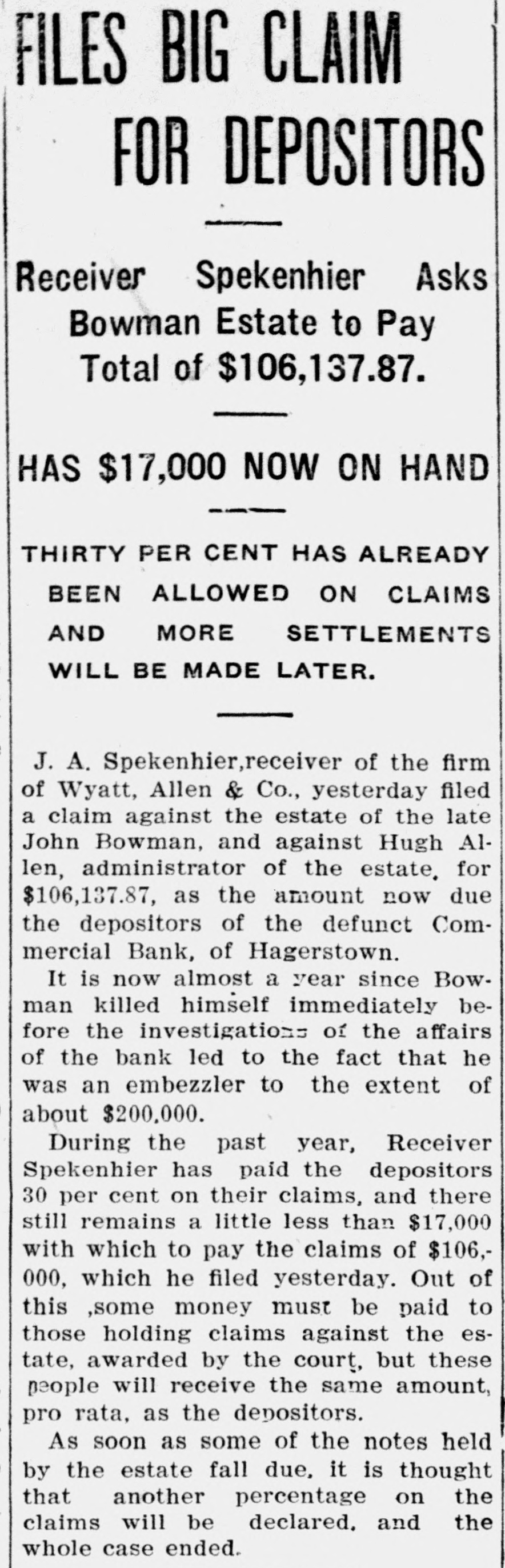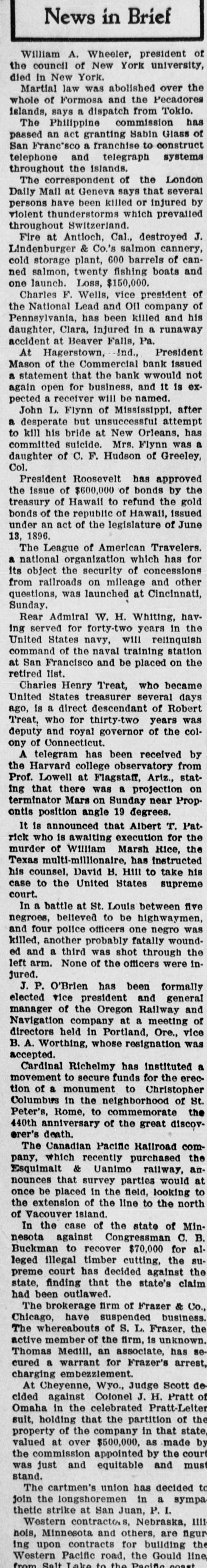 News in Brief William A. Wheeler, president of the council of New York university, died in New York. Martial law was abolished over the whole of Formosa and the Pecadores islands, says a dispatch from Tokio. The Philippine commission has passed an act granting Sabin Glass of San Franc'sco a franchise to construct telephone and telegraph systems throughout the islands. The correspondent of the London Daily Mail at Geneva says that several persons have been killed or injured by violent thunderstorms which prevailed throughout Switzerland. Fire at Antioch. Cal., destroyed J. Lindenburger & Co.'s salmon cannery, cold storage plant, 600 barrels of canned salmon, twenty fishing boats and one launch. Loss, $150,000. Charles F. Wells, vice president of the National Lead and Oil company of Pennsylvania, has been killed and his daughter, Clara, injured in a runaway accident at Beaver Falls, Pa. At Hagerstown, Ind., President Mason of the Commercial bank issued a statement that the bank wwould not again open for business, and it is expected a receiver will be named. John L. Flynn of Mississippi, after a desperate but unsuccessful attempt to kill his bride at New Orleans, has committed suicide. Mrs. Flynn was a daughter of C. F. Hudson of Greeley, Col. President Roosevelt has approved the issue of $600,000 of bonds by the treasury of Hawaii to refund the gold bonds of the republic of Hawaii, issued under an act of the legislature of June 13, 1896. The League of American Travelers. a national organization which has for its object the security of concessions from railroads on mileage and other questions, was launched at Cincinnati, Sunday. Rear Admiral W. H. Whiting, having served for forty-two years in the United States navy, will relinquish command of the naval training station at San Francisco and be placed on the retired list. Charles Henry Treat, who became United States treasurer several days Robert JO descripatin difeet B s1 '0.38 Treat, who for thirty-two years was deputy and royal governor of the colony of Connecticut. A telegram has been received by the Harvard college observatory from Prof. Lowell at Flagstaff, Ariz., statuo projection B SUM there that Sup terminator Mars on Sunday near Propontis position angle 19 degrees. It is announced that Albert T. Patrick who is awaiting execution for the murder of William Marsh Rice, the Texas multi-millionaire, has instructed his take 01 IIIH 'Я PLACE siq case to the United States supreme court. In a battle at St. Louis between five negroes, believed to be highwaymen, and four police officers one negro was killed, another probably fatally wounded and a third was shot through the left arm. None of the officers were inJured. J. P. O'Brien has been formally elected vice president and general manager of the Oregon Railway and Navigation company at a meeting of directors held in Portland, Ore., vice B. A. Worthing, whose resignation was accepted. Cardinal Richelmy has instituted a movement to secure funds for the erection of a monument to Christopher Columbus in the neighborhood of St. Peter's, Rome, to commemorate the -AÓOSID 180.18 the JO authorisary 44044 orer's death. The Canadian Pacific Railroad company, which recently purchased the Esquimalt & Uanimo railway, announces that survey parties would at once be placed in the field, looking to the extension of the line to the north of Vacouver island. In the case of the state of Minnesota against Congressman C. B. Buckman to recover $70,000 for alleged illegal timber cutting, the supreme court has decided against the state, finding that the state's claim had been outlawed. "OO 28 IO шлр brokerage euro Chicago, have suspended business. The whereabouts of S. L. Frazer, the active member of the firm, is unknown. Thomas Medill, an associate, has cured a warrant for Frazer's arrest, charging embezziement. At Cheyenne, Wyo., Judge Scott de cided against Colonel J. H. Pratt of Omaha in the celebrated Pratt-Leiter suit, holding that the partition of the property of the company in that state valued at over $500,000, as made by the commission appointed by the court was just and equitable and mus stand. The cartmen's union has decided Join the longshoremen in a sympa thetic strike at San Juan, P. I. Western contractors, Nebraska, IIII nois, Minnesota and others, are figur ing upon contracts for building the Western Pacific road. the Gould