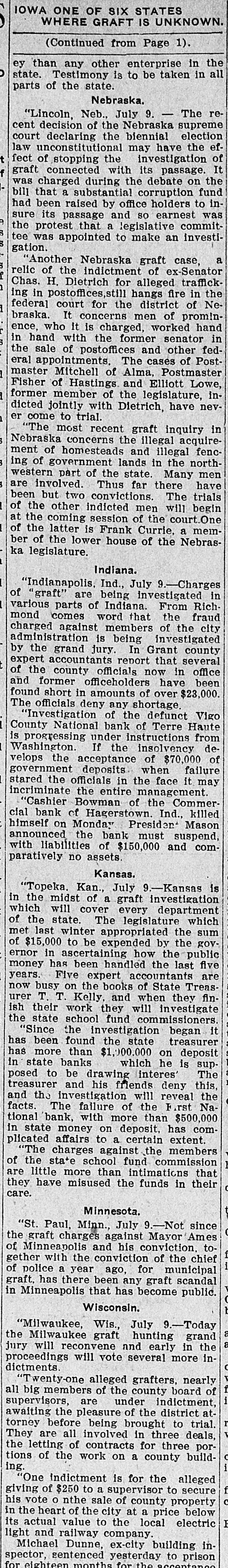 IOWA ONE OF SIX STATES WHERE GRAFT IS UNKNOWN. (Continued from Page 1). ey than any other enterprise in the state. Testimony is to be taken in all parts of the state. Nebraska. "Lincoln, Neb., July 9. - The recent decision of the Nebraska supreme court declaring the biennial election law unconstitutional may have the effect of stopping the investigation of graft connected with its passage. It was charged during the debate on the bill that a substantial corruption fund had been raised by office holders to insure its passage and so earnest was the protest that a legislative committee was appointed to make an investigation. "Another Nebraska graft case, a relic of the indictment of ex-Senator Chas. H. Dietrich for alleged trafficking in postoffices,still hangs fire in the federal court for the district of Nebraska. It concerns men of prominence, who It is charged, worked hand in hand with the former senator in the sale of postoffices and other federal appointments. The cases of Postmaster Mitchell of Alma, Postmaster Fisher of Hastings and Elliott Lowe, former member of the legislature, indicted jointly with Dietrich, have never come to trial. "The most recent graft inquiry in Nebraska concerns the illegal acquirement of homesteads and illegal fencing of government lands in the northwestern part of the state. Many men are involved. Thus far there have been but two convictions. The trials of the other indicted men will begin at the coming session of the court One of the latter is Frank Currie, a member of the lower house of the Nebraska legislature. Indiana. "Indianapolis, Ind., July 9.-Charges of "graft" are being investigated in various parts of Indiana. From Richmond comes word that the fraud charged against members of the city administration is being investigated by the grand jury. In Grant county expert accountants report that several of the county officials now in office and former officeholders have been found short in amounts of over $23,000. The officials deny any shortage "Investigation of the defunct Vigo County National bank of Terre Haute is progressing under instructions from Washington. If the insolvency develops the acceptance of $70,000 of government deposits when failure stared the officials in the face it may incriminate the entire management. "Cashier Bowman of the Commercial bank of Hagerstown. Ind., killed himself on Monday President Mason announced the bank must suspend, with liabilities of $150,000 and comparatively no assets. Kansas. "Topeka. Kan., July 9.-Kansas is in the midst of a graft investigation which will cover every department of the state. The legislature which met last winter appropriated the sum of $15,000 to be expended by the governor in ascertaining how the public money has been handled the last five years. Five expert accountants are now busy on the books of State Treasurer T. T. Kelly, and when they finish their work they will investigate the state school fund commissioners. "Since the investigation began it has been found the state treasurer has more than $1,000.000 on deposit in state banks which he is supposed to be drawing interest The treasurer and his friends deny this, and the investigation will reveal the facts. The failure of the First National bank, with more than $500,000 in state money on deposit, has complicated affairs to a certain extent. "The charges against the members of the state school fund commission are little more than intimations that they have misused the funds in their care. Minnesota. "St. Paul, Minn., July 9.-Not since the graft charges against Mayor Ames of Minneapolis and his conviction. together with the conviction of the chief of police a year ago, for municipal graft, has there been any graft scandal in Minneapolis that has become public. Wisconsin. "Milwaukee, Wis., July 9.-Today the Milwaukee graft hunting grand a jury will reconvene and early in the proceedings will vote several more indictments. "Twenty-one alleged grafters, nearly all big members of the county board of supervisors, are under indictment, awaiting the pleasure of the district attorney before being brought to trial. They are all involved in three deals, the letting of contracts for three portions of the work on a county building. "One indictment is for the alleged giving of $250 to a supervisor to secure bis.vote sale of county property