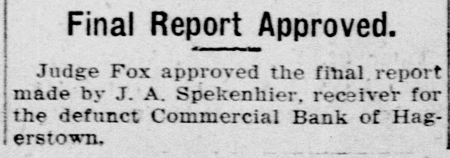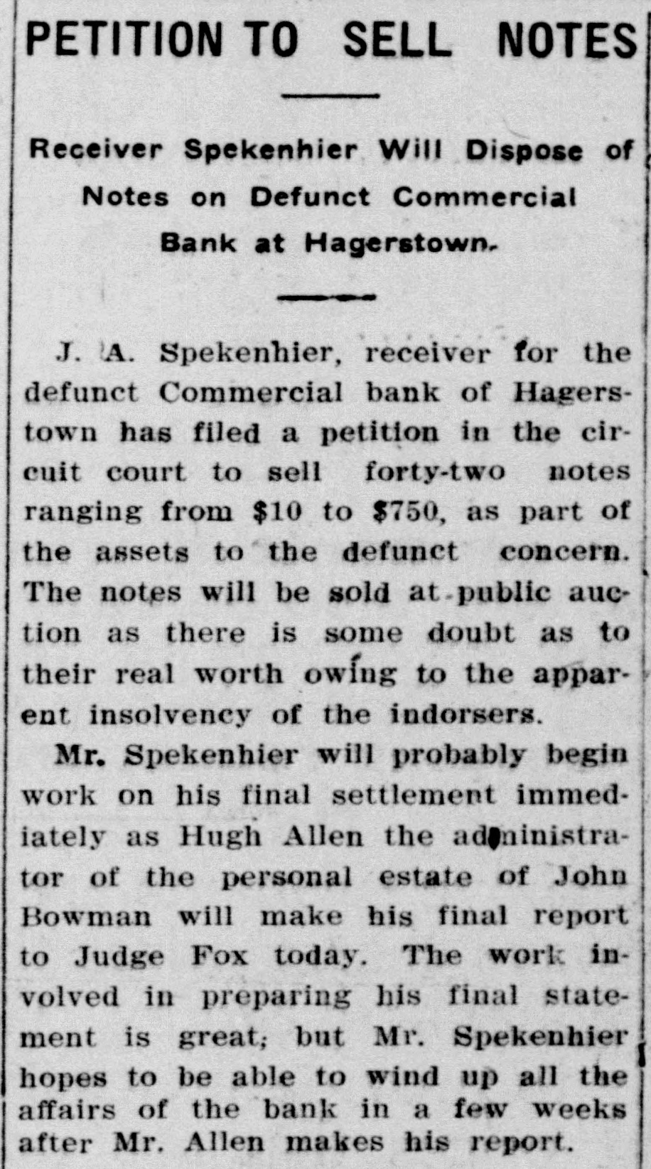 PETITION TO SELL NOTES Receiver Spekenhier Will Dispose of Notes on Defunct Commercial Bank at Hagerstown. J. A. Spekenhier, receiver for the defunct Commercial bank of Hagerstown has filed a petition in the circuit court to sell forty-two notes ranging from $10 to $750, as part of the assets to the defunct concern. The notes will be sold at-public auction as there is some doubt as to their real worth owing to the apparent insolvency of the indorsers. Mr. Spekenhier will probably begin work on his final settlement immediately as Hugh Allen the administrator of the personal estate of John Bowman will make his final report to Judge Fox today. The work involved in preparing his final statement is great; but Mr. Spekenhier hopes to be able to wind up all the affairs of the bank in a few weeks after Mr. Allen makes his report.