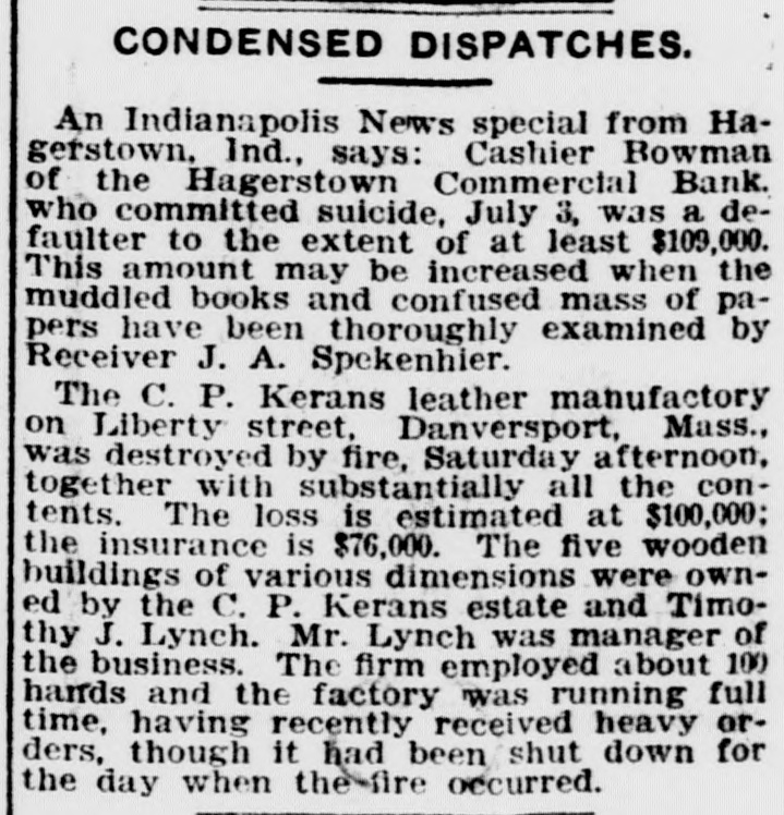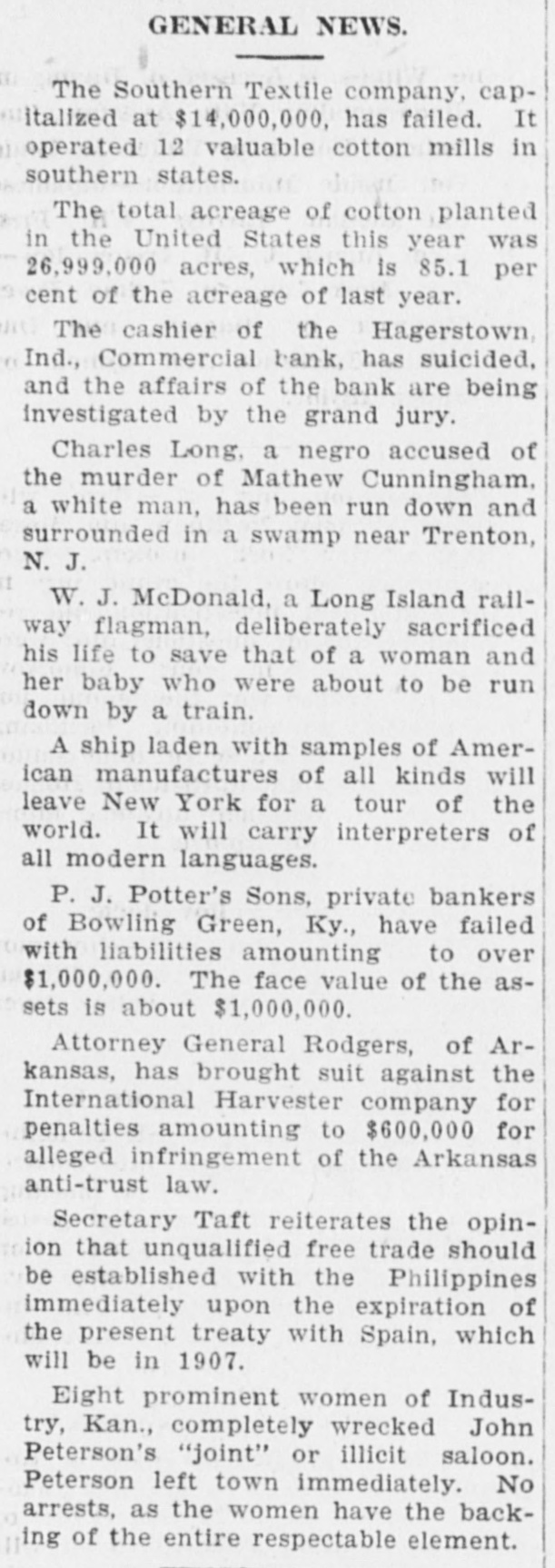 GENERAL NEWS. The Southern Textile company, capitalized at $14,000,000, has failed. It operated 12 valuable cotton mills in southern states. The total acreage of cotton planted in the United States this year was 26,999,000 acres, which is 85.1 per cent of the acreage of last year. The cashier of the Hagerstown, Ind., Commercial bank, has suicided, and the affairs of the bank are being investigated by the grand jury. Charles Long, a negro accused of the murder of Mathew Cunningham, a white man, has been run down and surrounded in a swamp near Trenton, N. J. W. J. McDonald, a Long Island railway flagman, deliberately sacrificed his life to save that of a woman and her baby who were about to be run down by a train. A ship laden with samples of American manufactures of all kinds will leave New York for a tour of the world. It will carry interpreters of all modern languages. P. J. Potter's Sons, private bankers of Bowling Green, Ky., have failed with liabilities amounting to over $1,000,000. The face value of the assets is about $1,000,000. Attorney General Rodgers, of Arkansas, has brought suit against the International Harvester company for penalties amounting to $600,000 for alleged infringement of the Arkansas anti-trust law. Secretary Taft reiterates the opinion that unqualified free trade should be established with the Philippines immediately upon the expiration of the present treaty with Spain, which will be in 1907. Eight prominent women of Industry, Kan., completely wrecked John Peterson's "joint" or illicit saloon. Peterson left town immediately. No arrests, as the women have the backing of the entire respectable element.