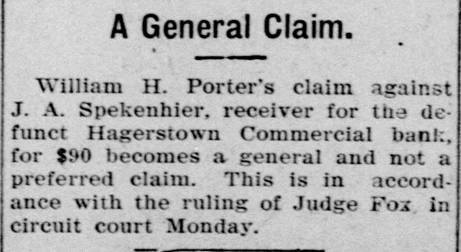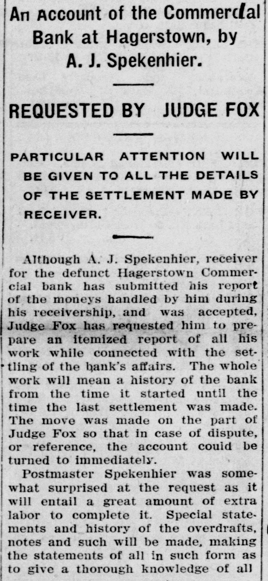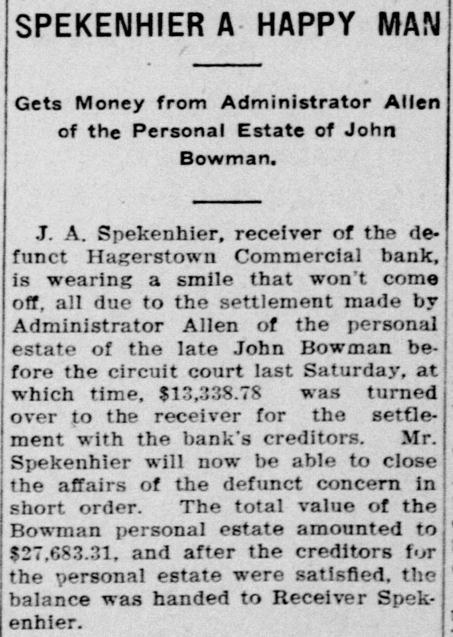 SPEKENHIER A HAPPY MAN Gets Money from Administrator Allen of the Personal Estate of John Bowman. J. A. Spekenhier, receiver of the defunct Hagerstown Commercial bank, is wearing a smile that won't come off, all due to the settlement made by Administrator Allen of the personal estate of the late John Bowman before the circuit court last Saturday, at which time, $13,338.78 was turned over to the receiver for the settlement with the bank's creditors. Mr. Spekenhier will now be able to close the affairs of the defunct concern in short order. The total value of the Bowman personal estate amounted to $27,683.31, and after the creditors for the personal estate were satisfied, the balance was handed to Receiver Spekenhier.