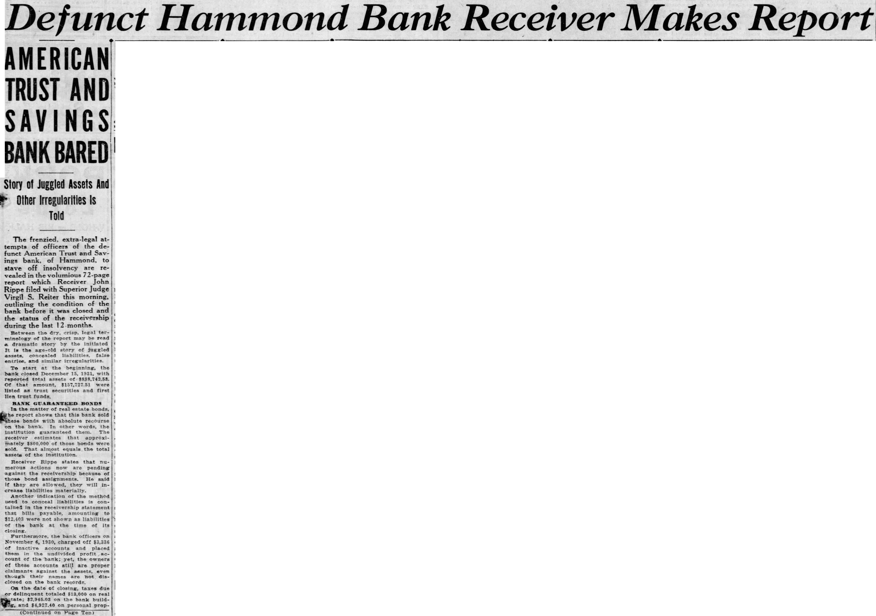 Defunct Hammond Bank Receiver Makes Report AMERICAN TRUST AND SAVINGS BANK BARED Story of Juggled Assets And Other Irregularities Is Told The frenzied. extra-legal attempts of officers of the defunct American Trust and Savings bank. of Hammond, to stave off insolvency are revealed in the volumious 72-page report which Receiver John Rippe filed with Superior Judge Virgil S. Reiter this morning, outlining the condition of the bank before it was closed and the status of the receivership during the last 12 months. Between the dry. crisp, legal terminology the report may dramatic story by the initiated It is the age-old of juggled false entries, and similar irregularities. To start at the the bank closed reported total that amount, listed as trust securities and first lien trust BANK GUARANTEED BONDS In shows this bank sold bonds with absolute recourse words, the receiver mately of sold. That equals the total of the institution. Receiver Rippe states that numerous are pending against the receivership those assignments. He said they will inliabilities materially. the method conceal liabilities is contained the receivership statement payable, bank at the time of its closing. the bank officers November 6, 1930, charged off $3,336 of accounts and placed them the undivided profit count of the bank; the owners of these accounts still are proper claimants against the assets, even though their names closed on the bank records. On the date of closing, taxes due delinquent totaled real the bank build$4,927.40 on personal prop(Continued on Page Ten)