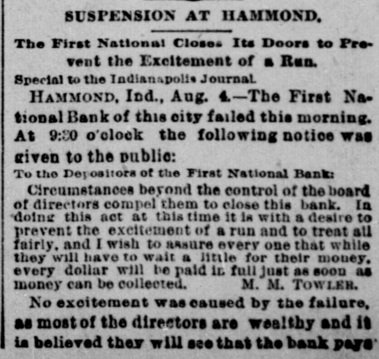 SUSPENSION AT HAMMOND, The First National Closes Its Doors to Prevent the Excitement of n Run. Special to the Indianapolis Journal HAMMOND, Ind., Aug. 4.-The First Na. tional Bank of this city failed this morning. At 9:30 o'clock the following notice was given to the public: To the Depositors of the First National Bank: Circumstances beyond the control of the board of directors compel them to close this bank. In doing this act at this time it is with a desire to prevent the excitement of a run and to treat all fairly, and I wish to assure every one that while they will have to wait a little for their money. every dollar will be paid in full just as soon as M. M. TOWLER. money can be collected. No excitement was caused by the failure, as most of the directors are wealthy and is is believed they will see that the bank pays