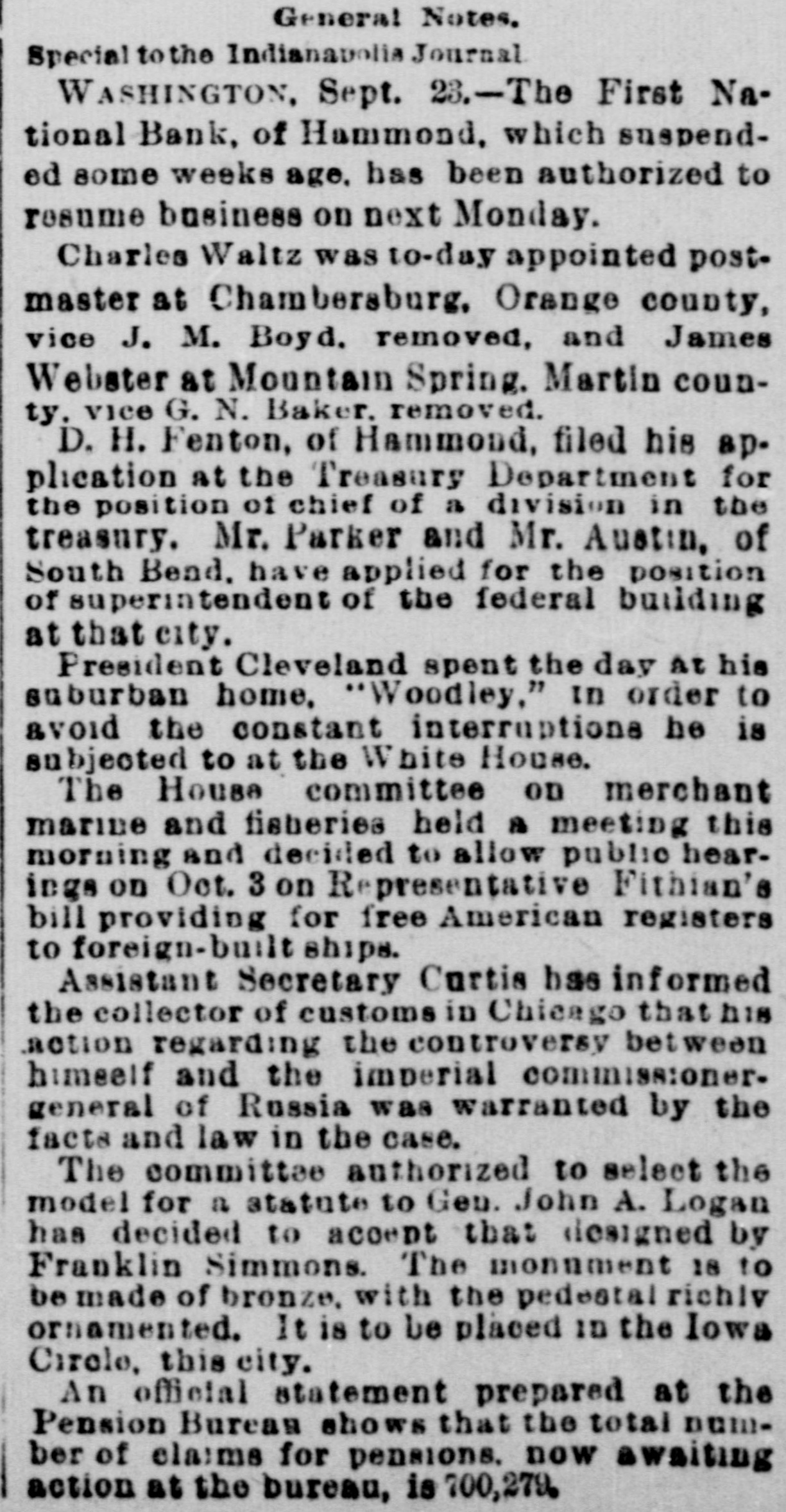 General Notes. Special to the Indianapolis Journal WASHINGTON, Sept. 23.-The First National Bank, of Hammond, which suspended some weeks age. has been authorized to resume business on next Monday. Charles Waltz was to-day appointed postmaster at Chambersburg. Orange county, vice J. M. Boyd. removed, and James Webster at Mountain Spring. Martin county. vice G. N. Baker. removed. D. H. Fenton, of Hammond, filed his ap. plication at the Treasury Department for the position of chief of a division in the treasury. Mr. Parker and Mr. Austin, of South Bend, have applied for the position of superintendent of the federal building at that city. President Cleveland spent the day At his suburban home, "Woodley," in order to avoid the constant interruptiona he is subjected to at the White House. The House committee on merchant marine and fisheries held a meeting this morning and decided to allow public hearings on Oct. 3 on Representative Fithian's bill providing for free American registers to foreign-built ships. Assistant Secretary Curtis has informed the collector of customs in Chicago that his action regarding the controversy between himeelf and the imperial commiss:onergeneral of Russia was warranted by the facts and law in the case. The committee authorized to select the model for a statute to Gen. John A. Logan has decided to accept that designed by Franklin Simmons. The monument 18 to be made of bronze, with the pedestal richly ornamented. It is to be placed ID the Iowa Circle, this city. An official statement prepared at the Pension Bureau shows that the total number of claims for pensions. now awaiting action at the bureau, is 700,279.