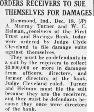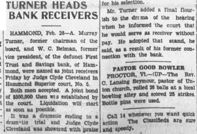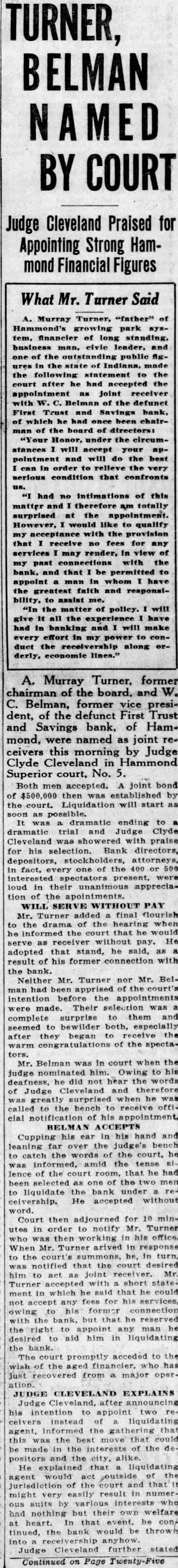 A. Murray Turner, former chairman of the board, and W. C. Belman, former vice president, of the defunct First Trust and Savings bank, of Hammond, were named as joint receivers this morning by Judge Clyde Cleveland in Hammond Superior court, No. 5. Both men accepted. A joint bond of $500,000 then established by the Liquidation will start as It ending to dramatic trial and Judge Clyde Cleveland praise for his selection. Bank directors, depositors, stockholders, attorneys, in fact, one of or 500 interested spectators present, were loud in their unanimous appreciation of the apointments. WILL SERVE WITHOUT PAY Mr. Turner added final flourish the drama of the hearing he informed the court that he would serve as pay. He adopted that stand, he said, result of his former with the bank. Neither Mr. Turner nor Mr. Belhad of the court's intention before the were made. Their selection complete surprise them and seemed to bewilder both, especially after they began to the of the spectators. Mr. Belman was in court when the nominated him. to his judge deafness, he did not hear the words Cleveland therefore of surprised he called to the bench cial of his ACCEPTS Cupping his ear in his hand and leaning far the judge's bench to the was the tense lence of the that he had selected as of the to liquidate the bank under ceivership. He accepted without word. adjourned for 10 Court then in order to notify Mr. Turner working in his office. When Mr. Turner arived in to summons, he, in notified that the court desired him to as Turner in which he that he could any owing but he reserved appoint he desired aid him in the court promptly acceded to the the has from major ation. JUDGE CLEVELAND EXPLAINS Judge Cleveland, his intention to appoint ceivers instead liquidating agent, the that this the that could be made the of the and the He explained that liquidating would act the of the court and might very easily result suits by various had nothing but their welfare at heart. In event, he conthe bank would be thrown tinued, anyhow. Judge Cleveland further stated Continued Page Twenty-Five