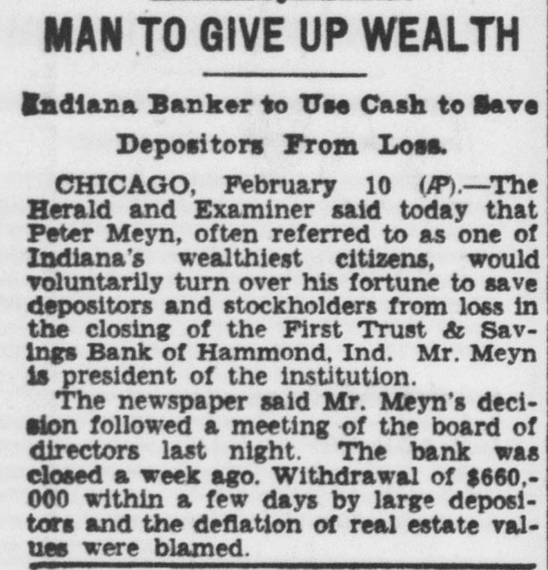 MAN TO GIVE UP WEALTH Indiana Banker to Use Cash to Save Depositors From Loss. CHICAGO, February 10 (AP)-The Herald and Examiner said today that Peter Meyn, often referred to as one of Indiana's wealthiest citizens, would voluntarily turn over his fortune to save depositors and stockholders from loss in the closing of the First Trust & Savings Bank of Hammond, Ind. Mr. Meyn is president of the institution. The newspaper said Mr. Meyn's decision followed a meeting of the board of directors last night. The bank was closed a week ago. Withdrawal of $660,000 within a few days by large depositors and the deflation of real estate values were blamed.