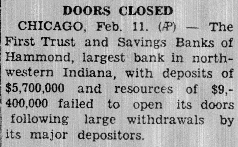 DOORS CLOSED CHICAGO, Feb. 11. (AP) - The First Trust and Savings Banks of Hammond, largest bank in northwestern Indiana, with deposits of $5,700,000 and resources of $9,400,000 failed to open its doors following large withdrawals by its major depositors.