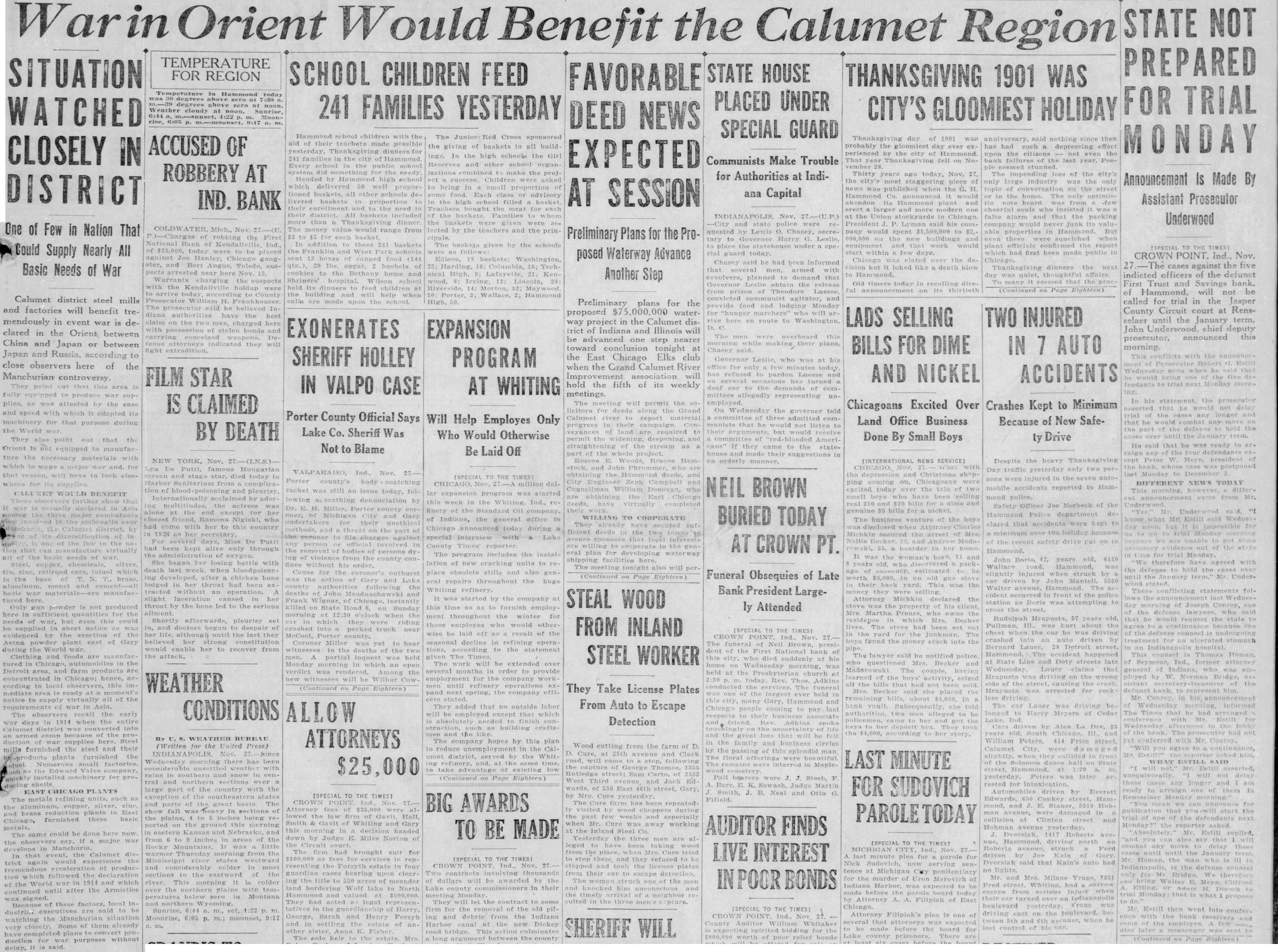 STATE NOT War Orient Would Benefit the Calumet Region PREPARED SITUATION STATE HOUSE THANKSGIVING 1901 WAS PLACED UNDER FOR TRIAL CITY'S GLOOMIEST HOLIDAY WATCHED SPECIAL GUARD day of 1901 anniversary, then ACCUSED OF probably the day ever has had such depressing effect CLOSELY IN EXPECTED perienced by the city of upon the