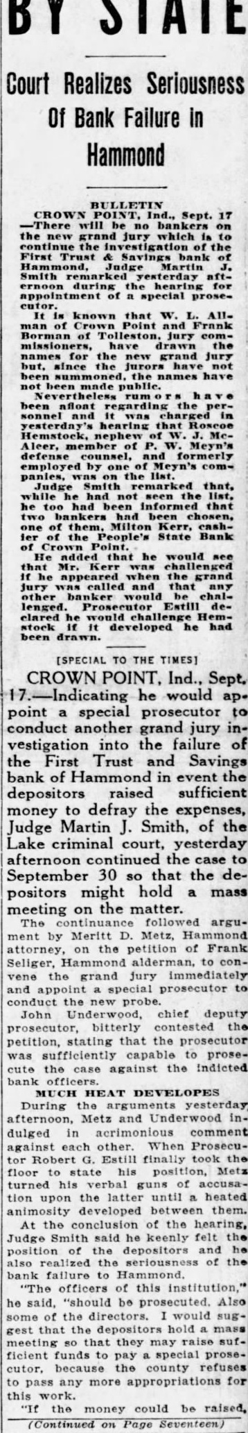 [SPECIAL TO THE TIMES) CROWN POINT, Ind., Sept. 17 Indicating he would appoint special prosecutor to conduct another grand jury investigation into the failure of the First Trust and Savings bank of Hammond in event the depositors raised sufficient money to defray the expenses, Judge Martin J. Smith, of the Lake criminal court, yesterday afternoon continued the case to September 30 so that the depositors might hold a mass meeting on the matter. by Meritt Metz, Hammond on the petition of Frank attorney, Seliger, alderman, to conappoint special prosecutor to conduct new probe. John Underwood, chief deputy bitterly the prosecutor, petition, stating that the was sufficiently capable prosecute the against the bank officers. MUCH HEAT DEVELOPES During arguments yesterday afternoon, Metz and indulged against each other. When Prosecutor Robert G. Estill finally took the floor his turned his of tion upon the latter heated developed between them. the of the hearing, Judge Smith said he keenly felt the of the depositors and position realized the seriousness of the also bank failure to Hammond. officers of this institution," he said, "should be prosecuted. Also the directors. would sugthat the depositors hold gest meeting that they may ficient funds pay special prosebecause the county refuses to pass more for this work. "If the money could be raised, (Continued on Seventeen)