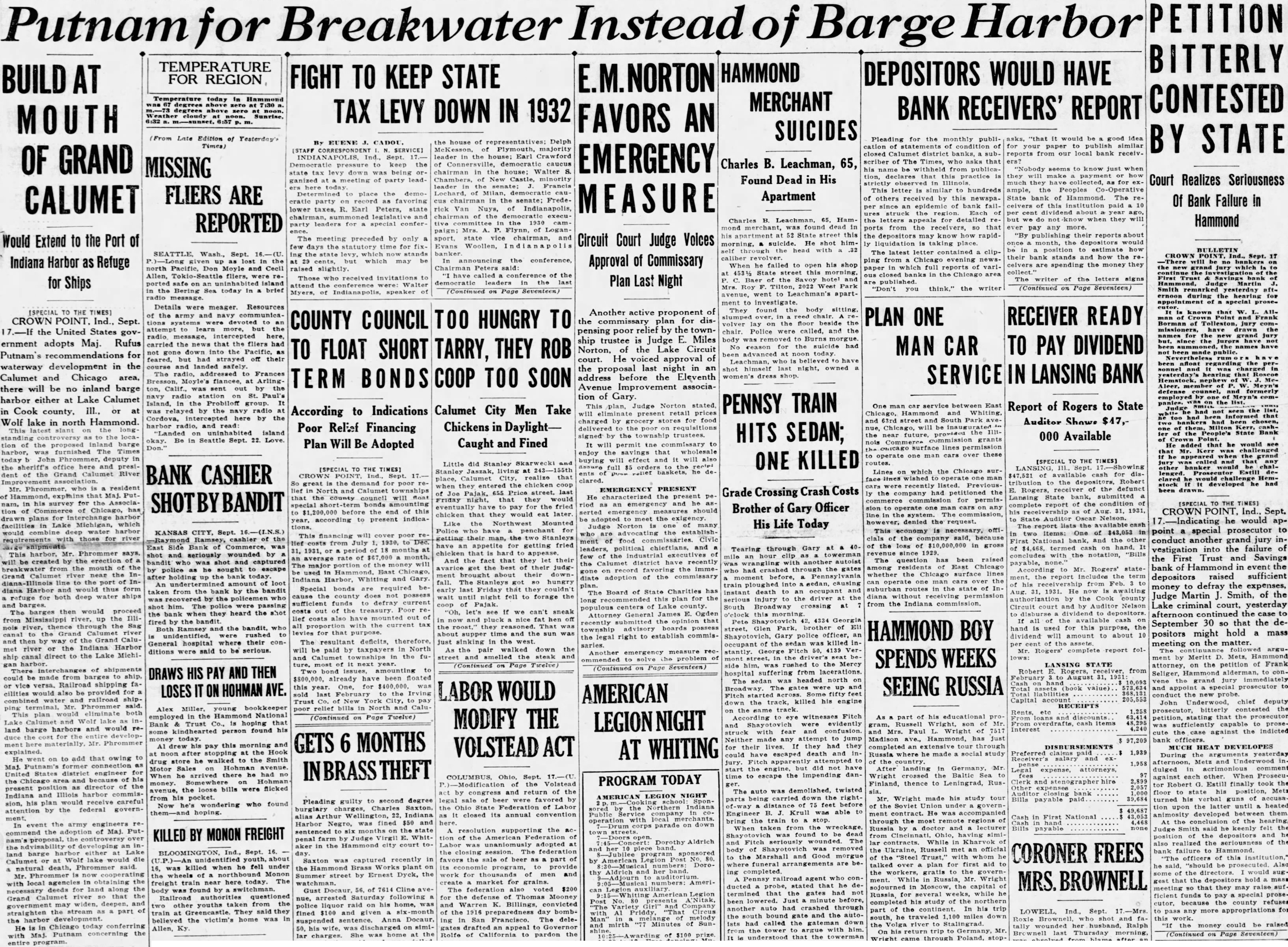 PETITION Putnam for Breakwater Instead of Barge Harbor BITTERLY TEMPERATURE HAMMOND DEPOSITORS WOULD HAVE FIGHT TO KEEP STATE BUILD AT FOR REGION Temperature today Hammond CONTESTED MERCHANT BANK RECEIVERS' REPORT above TAX LEVY DOWN IN 1932 FAVORS AN MOUTH SUICIDES Edition of Pleading for good idea BY STATE By EUENE of Delph Times) cation statements condition paper publish similar of Plymouth, closed district banks, sub- reports from our local bank receivSept. leader in Earl Crawford
